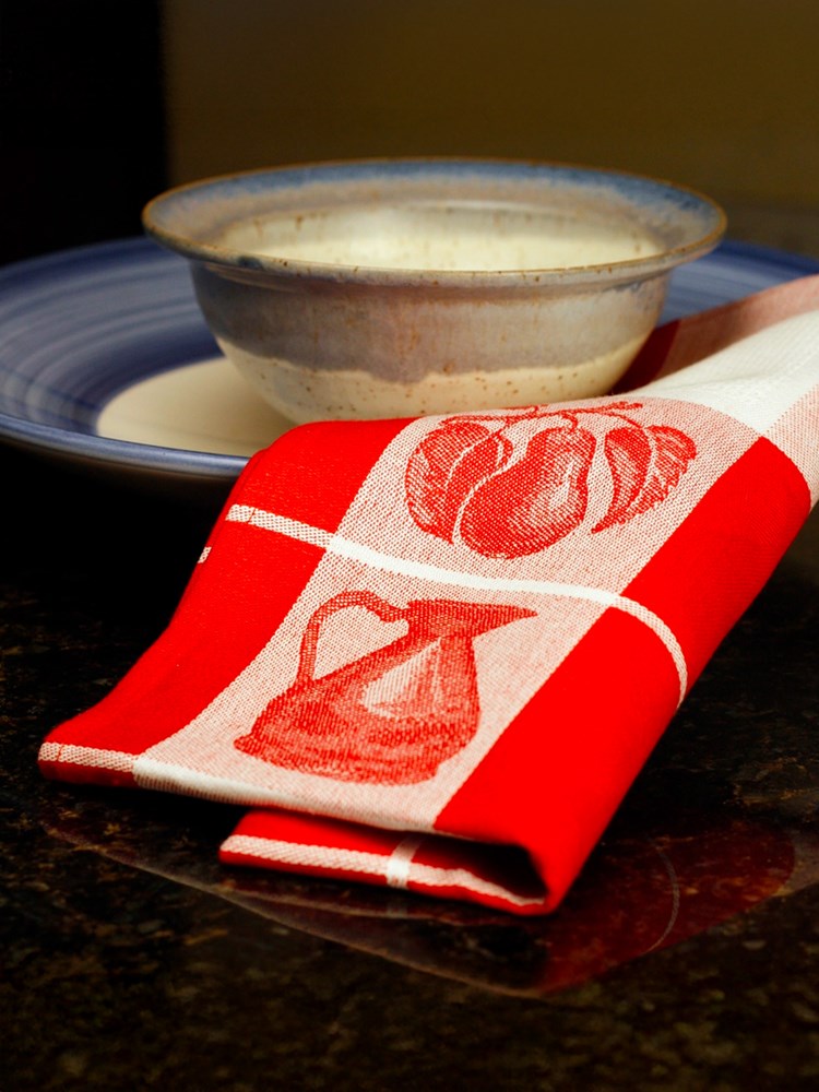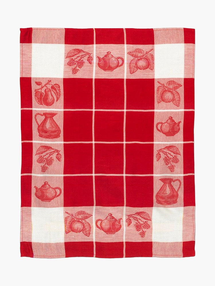 This Fruit & Refreshments Linen and Cotton Towel features a fruit and beverage design with a red check background. A great towel for drying and cleaning in the kitchen that won't leave lint behind. These are easy to wash and won't shrink. They look great hung in the kitchen or used as a tray or breadbasket liner.