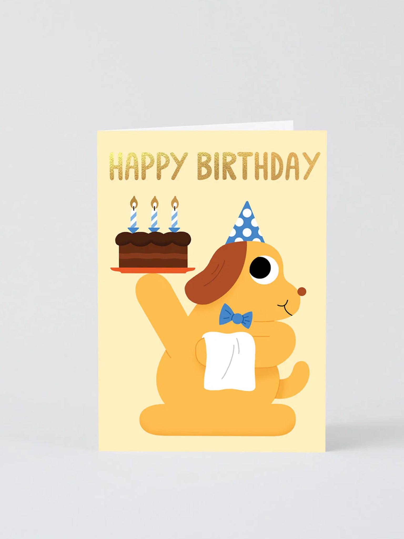 This cute canine is ready with cake and candles. Designed in an irresistibly fun-filled style, gold foil finishing gives this greetings card an extra birthday sparkle. 10.9cm x 15.5cm (folded) Materials: Comes packed with a white envelope in a clear biodegradable cello bag. Printed in the UK on uncoated FSC-certified card, using vegetable-based inks. Blank inside for your own message.