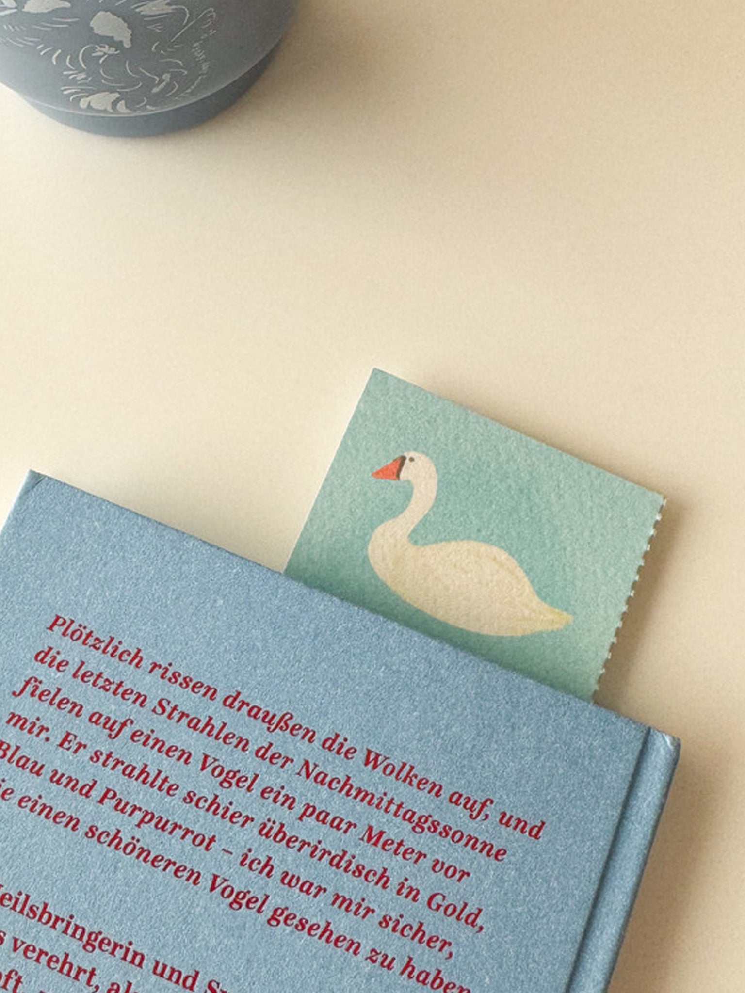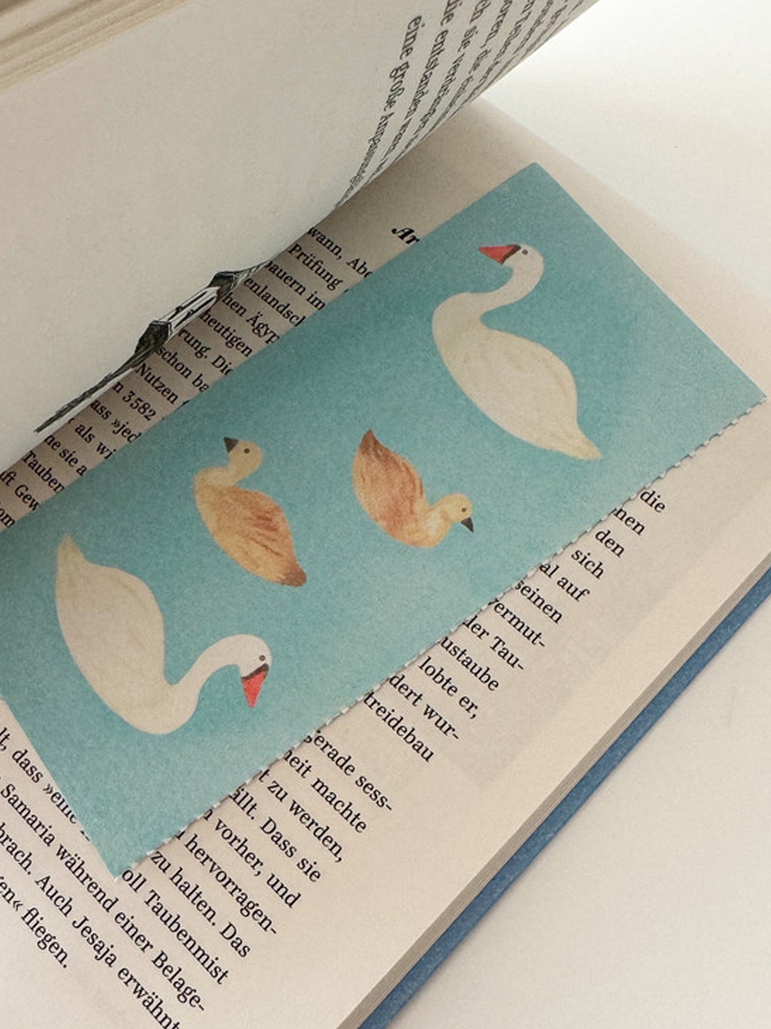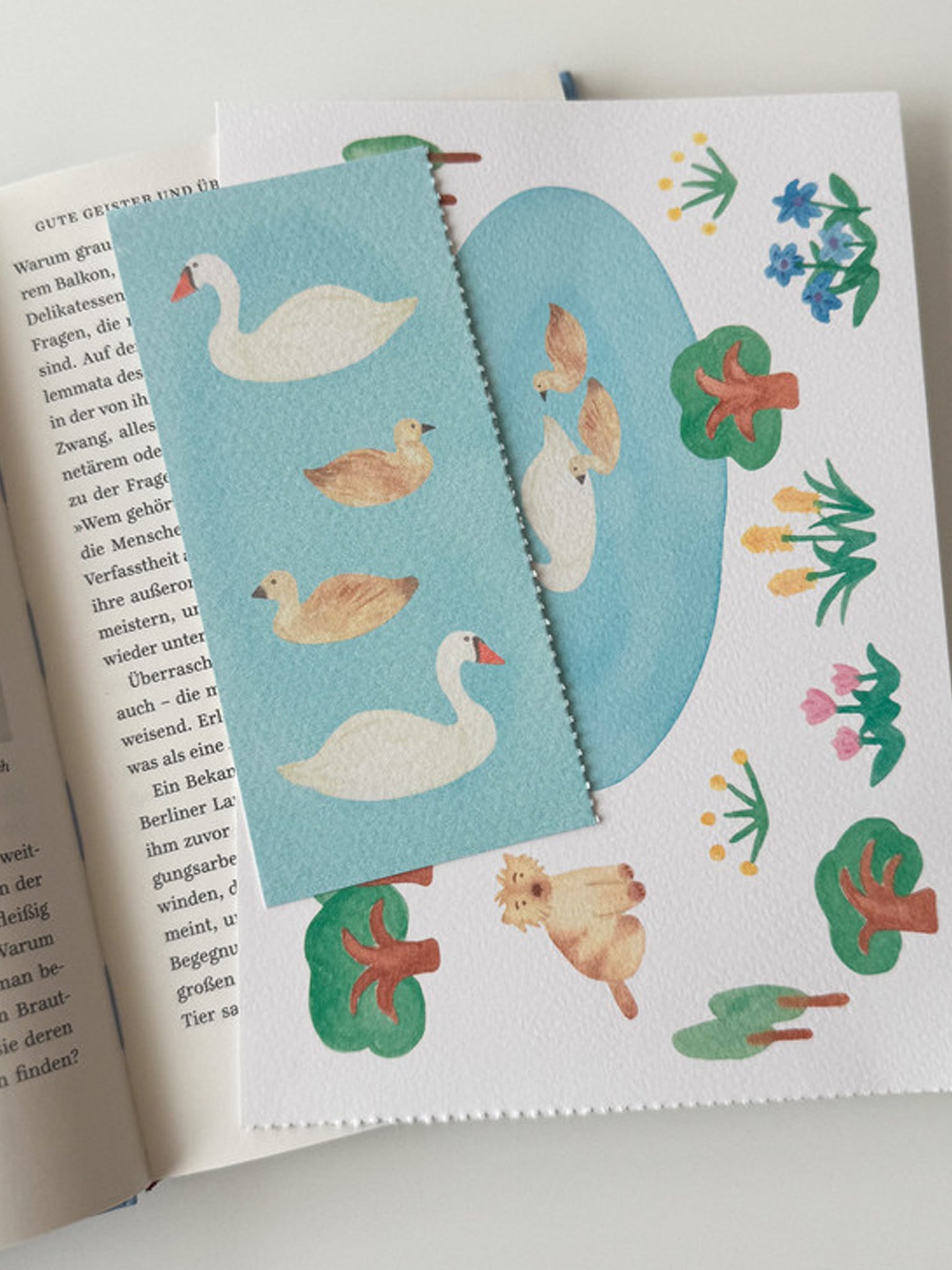 'Lucy Meets the Swan Family' Bookmark Postcard by Eunji Ryu. If you tear along the perforation on the side, the postcard becomes a bookmark.