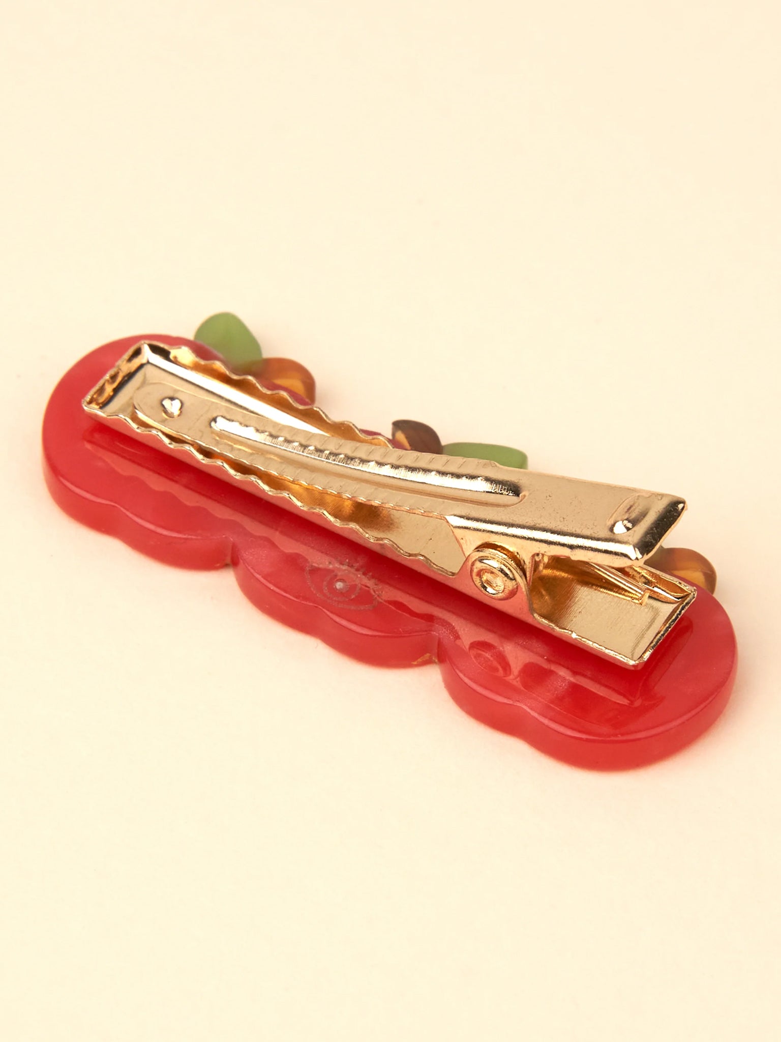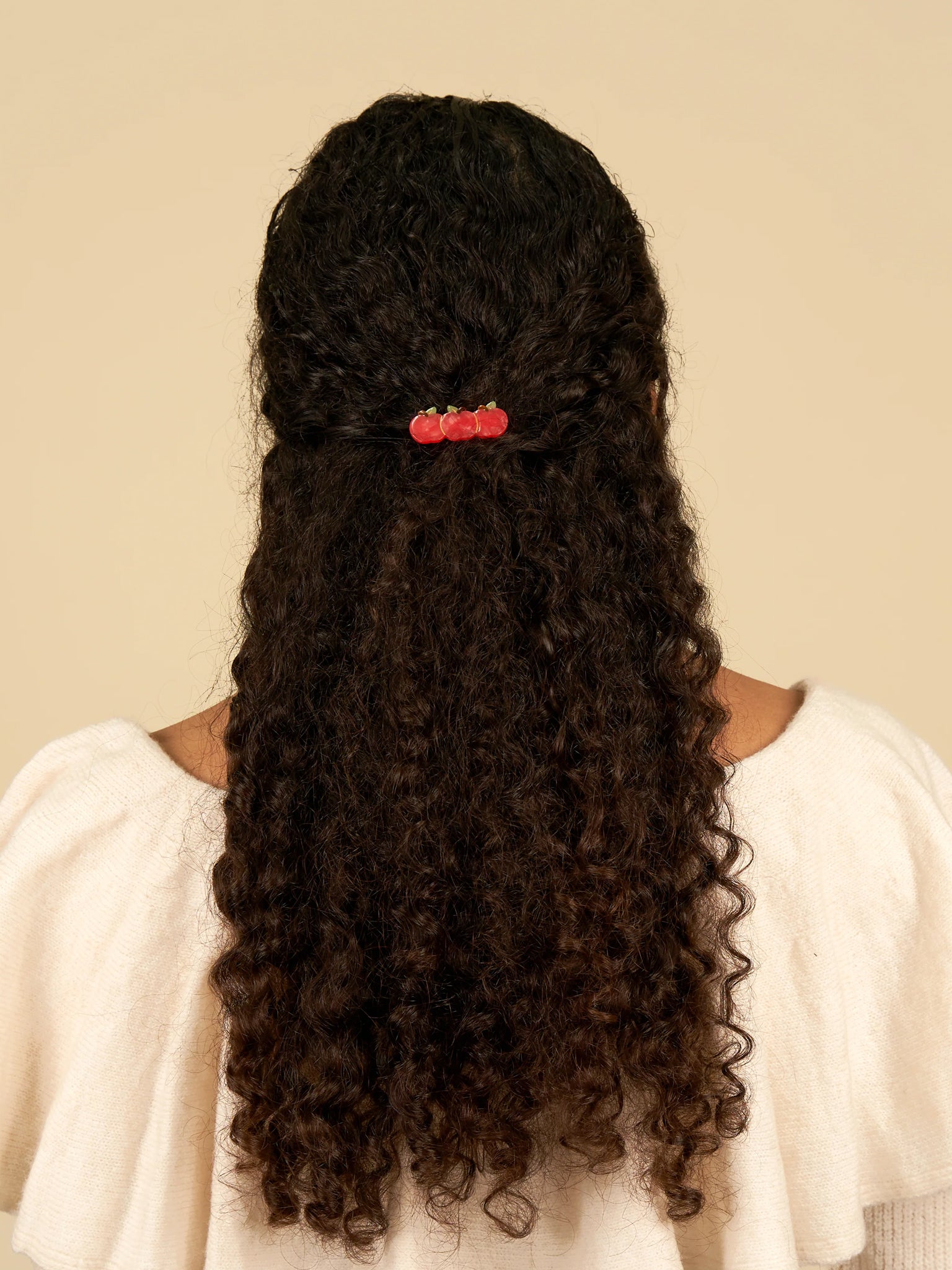 A pretty hair clip decorated with three little red apples. We love this seasonal fruit accessory