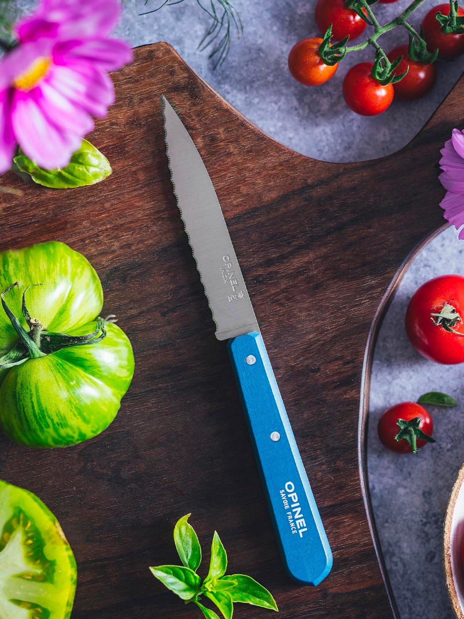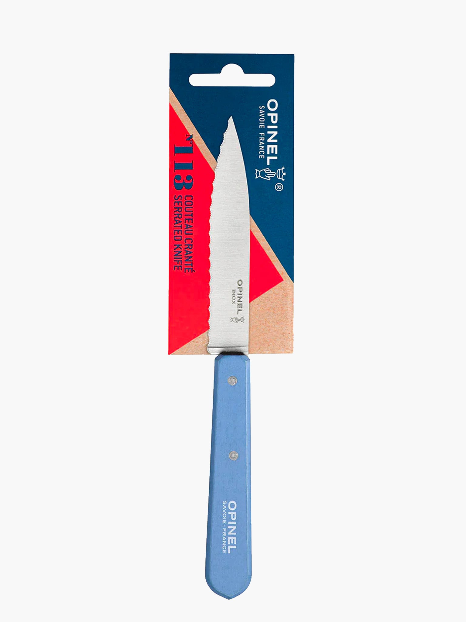 The Opinel Serrated Knife N°113 is expertly crafted for slicing a variety of foods, including tomatoes, hard-boiled eggs, and kiwi fruit. It features a micro-serrated blade measuring 10 cm, made from high-quality Sandvik stainless steel, which ensures exceptional sharpness and resistance to abrasion. The handle is protected by a layer of varnish, enhancing its durability and ease of maintenance. With its elegant design and practical functionality, the Opinel Serrated Knife N°113 is an essential addition to your kitchenware.