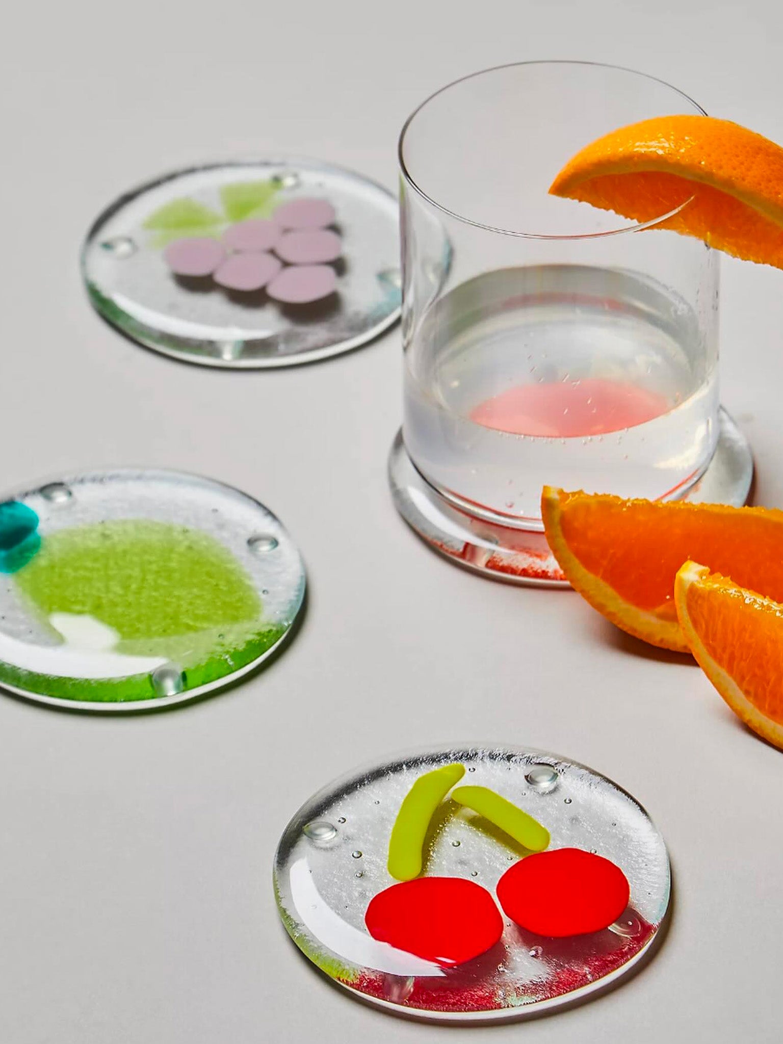 DOT's Fruity collection is made using glass fusion, a process of cutting, shaping, and layering pieces of raw glass and fusing them together in a kiln at an extremely high temperature.