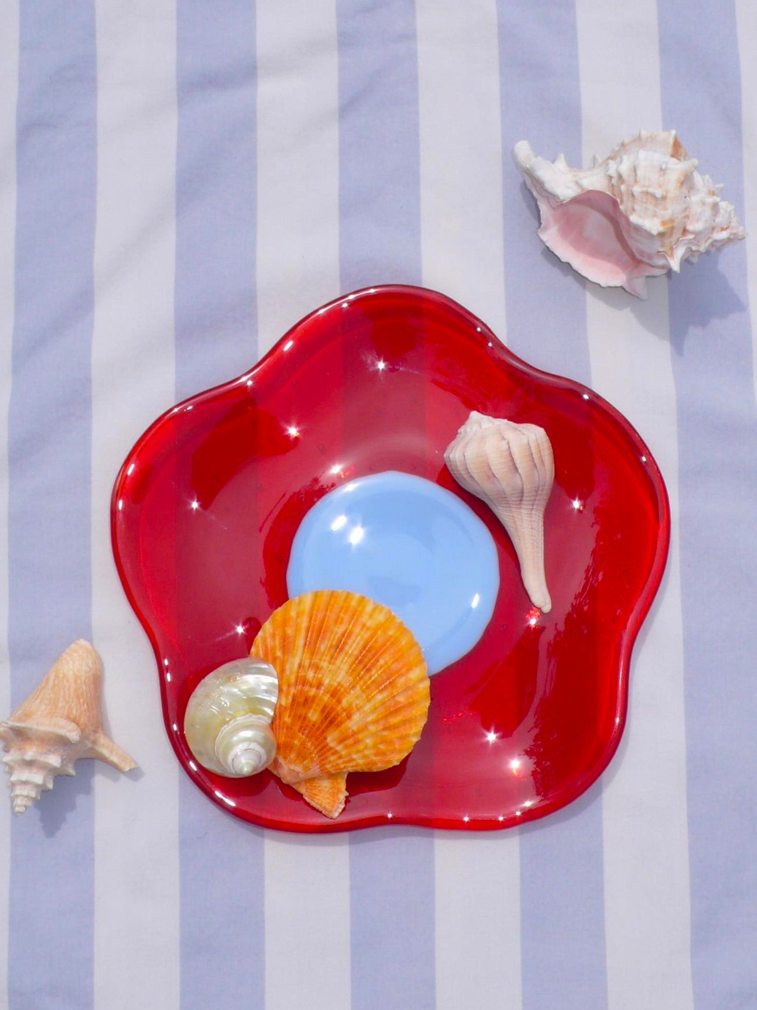 DOT's Flower Plate collection is made using glass fusion, a process of cutting, shaping, and layering pieces of raw glass and fusing them together in a kiln at an extremely high temperature.