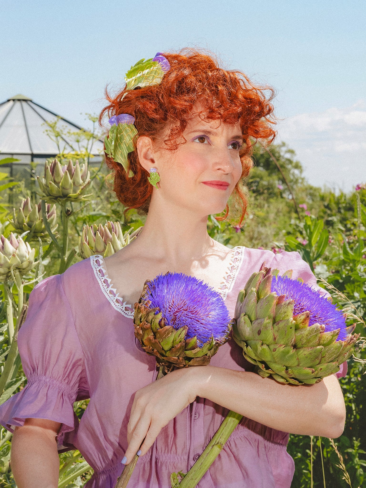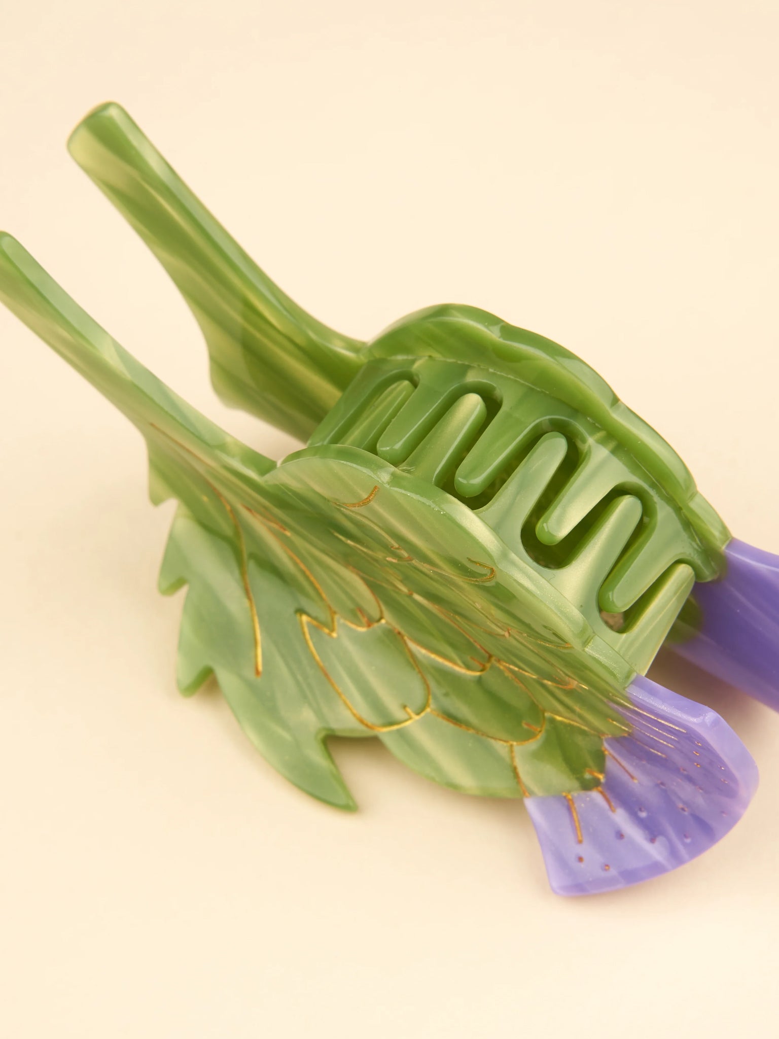 We just can’t stop dreaming up the wildest hair claws — and here comes our incredible artichoke flower clip! A gorgeous veggie in pearly green acetate, crowned with a stunning purple bloom that could charm a whole swarm of bees. A quirky, feel-good vegetable hair accessory that brings back memories of the best springtime lunches. Yum!
