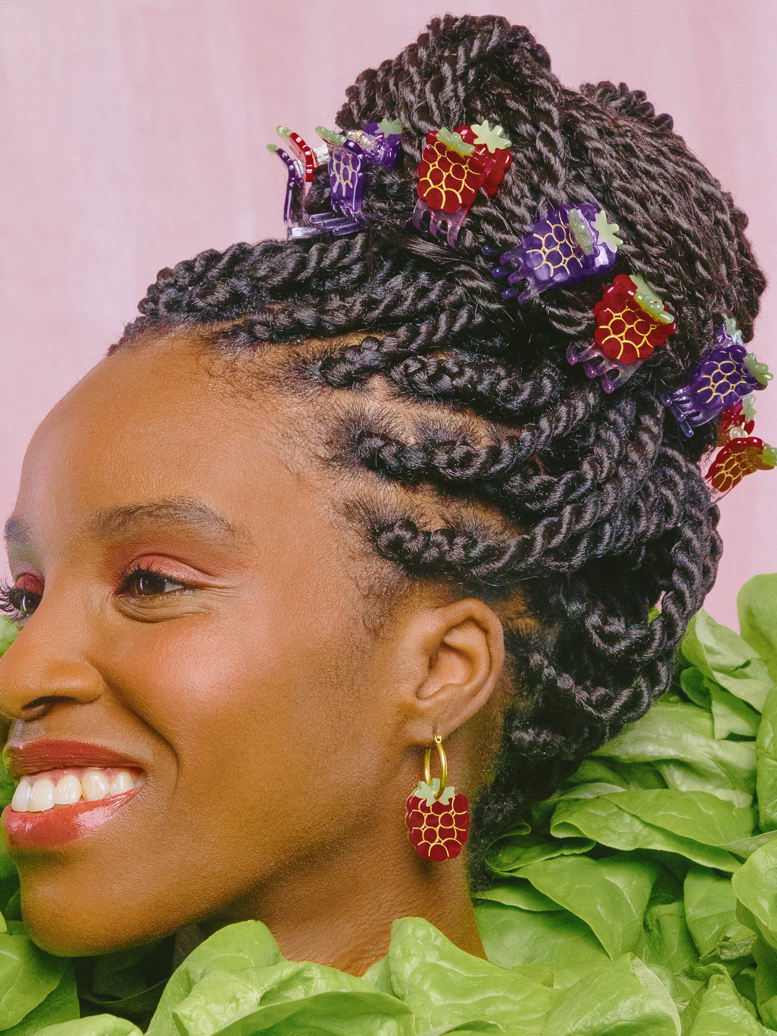 A mini hair claw shaped as a blackberry, with a cute green fig leaf and pretty golden details that make this accessory look like a true little jewel! This mini claw is a new size created for short hair (well-known to be all over the place), as well as long mane. A very handy clip to add a colorful and sweet touch to all of your hair styles!
