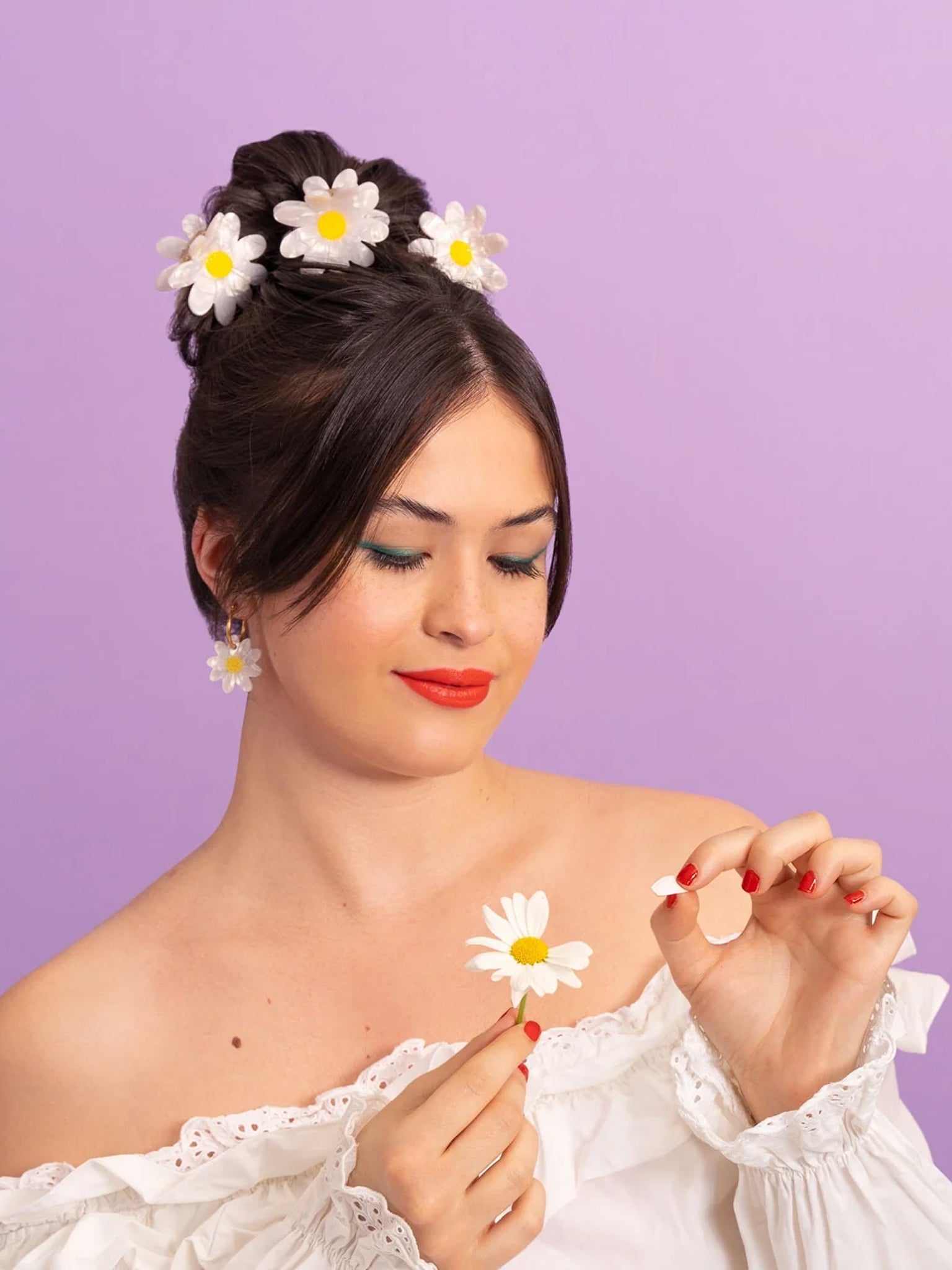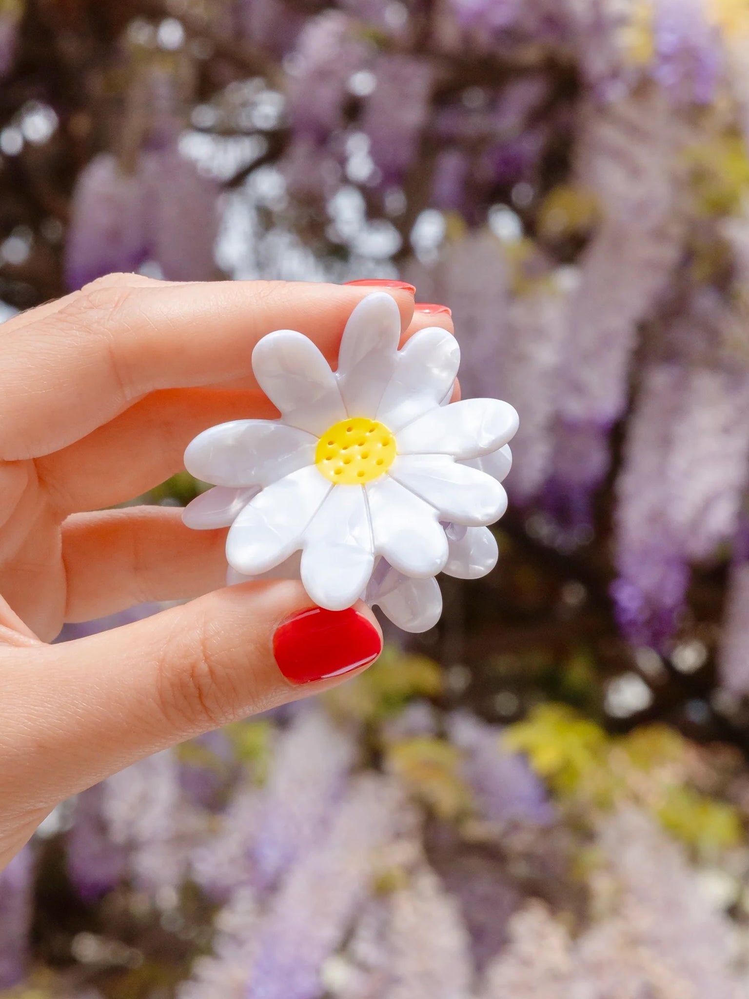 A pretty white and yellow daisy, to pay tribute to these little flower and butterfly clips that were all the rage in the 90’s with a zigzag part! We have to admit we favour the modern and elegant version.