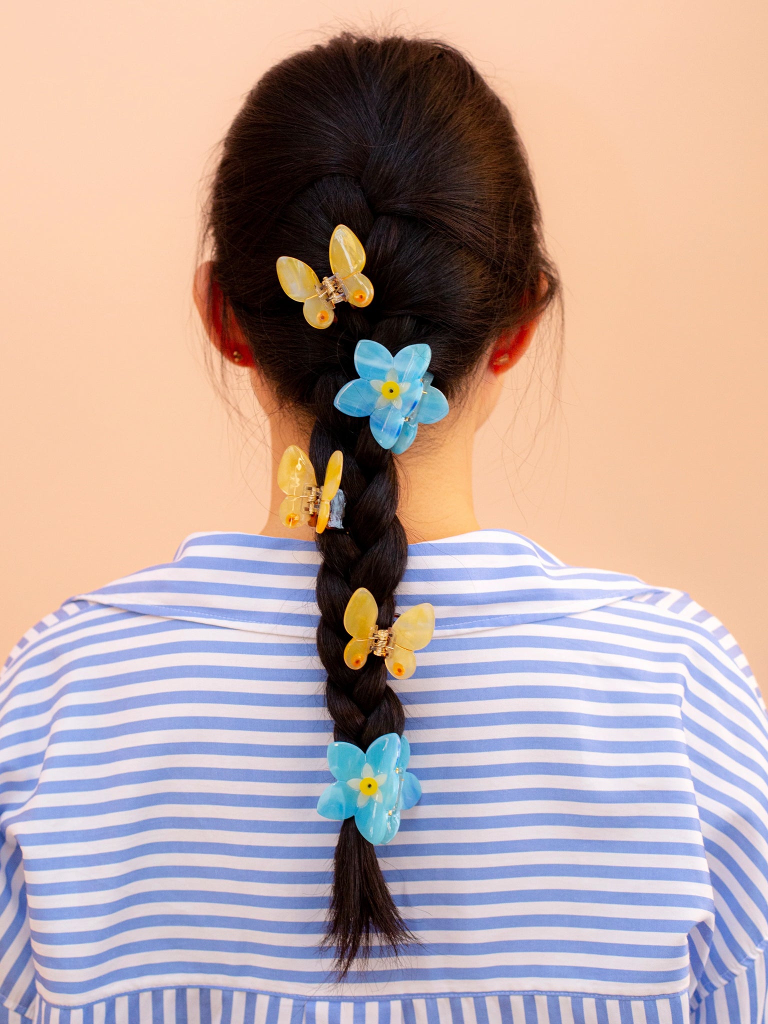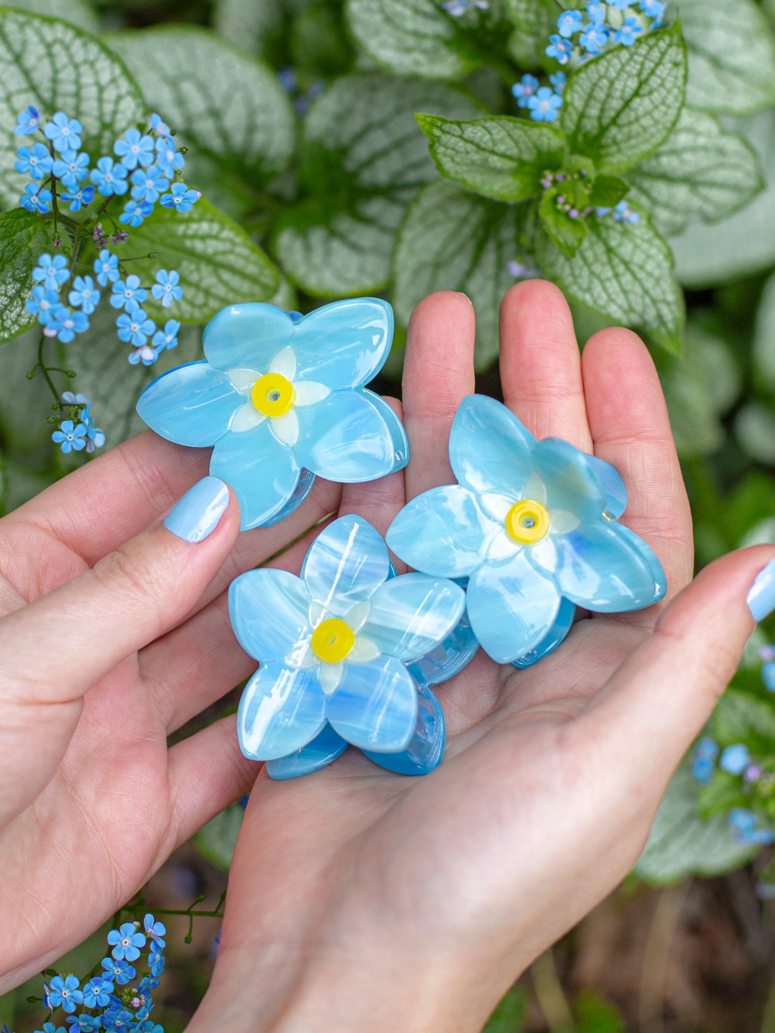 A gorgeous hair claw shaped as a forget-me-not with pretty blue petals, a light yellow heart and a tiny hole in the middle, just like the real one (look closer the next time you see one if you didn’t notice before!). A beautiful flower with the most romantic name. This accessory will look fantastic as the final touch of your messy bun, as a floral crown if you use several of them, or as a cute ornament on your bag handle while you’re not using it.