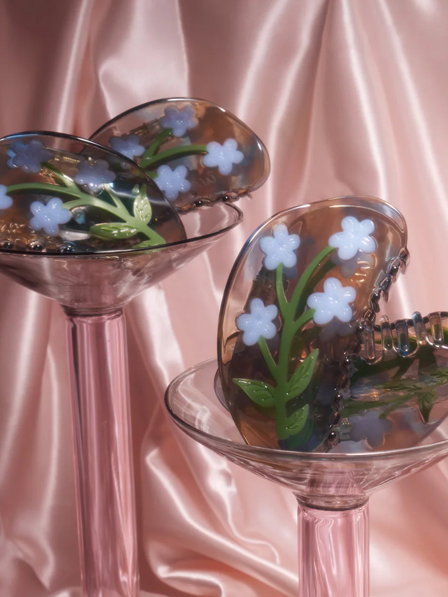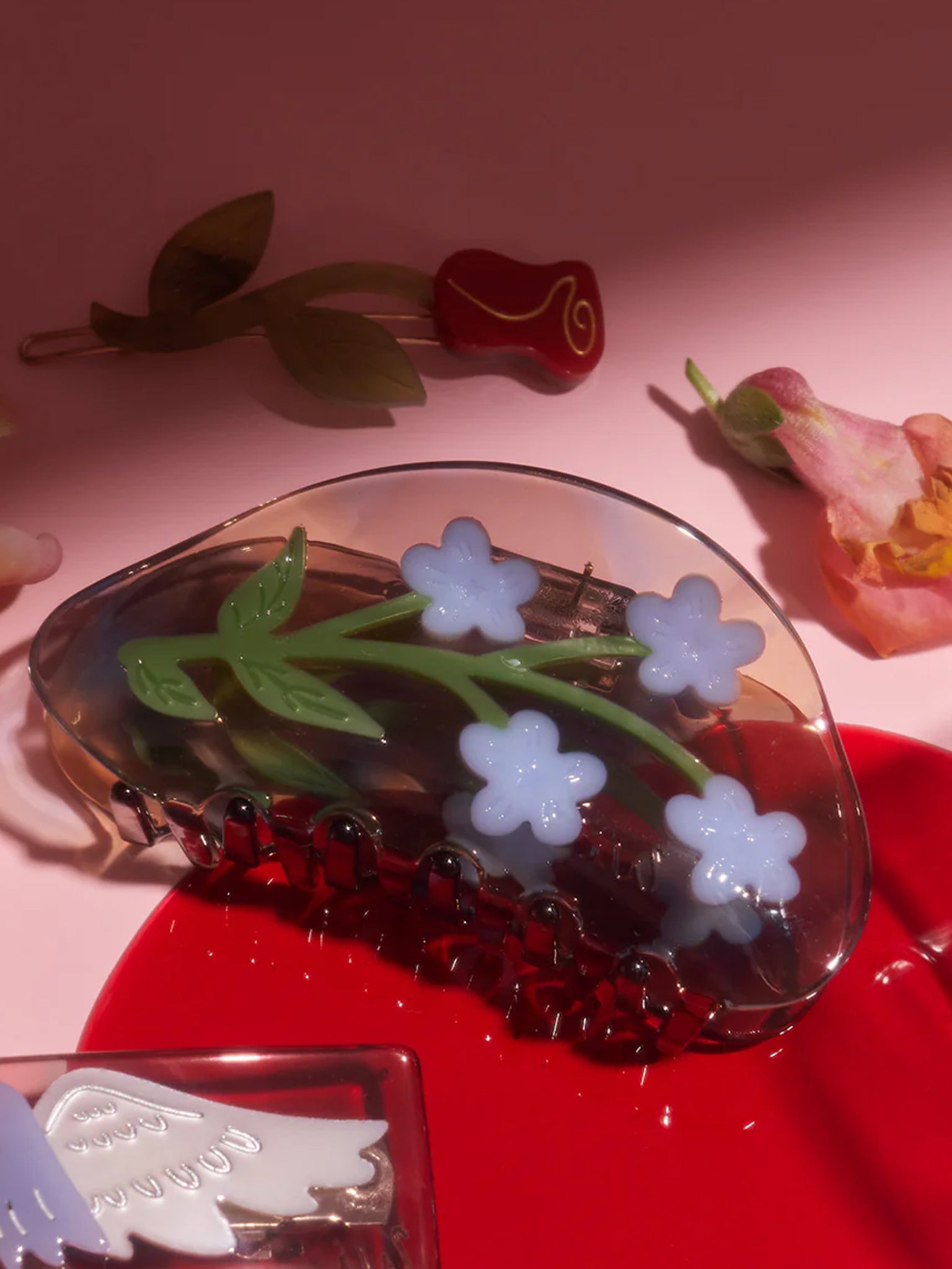 Forget-Me-Not Claw The Forget-Me-Not symbolizes long-lasting love and loyalty. In the style of our other classic floral claws, but more detailed! This sprig of sweet light blue flowers is ready to become your new favorite hair claw.
