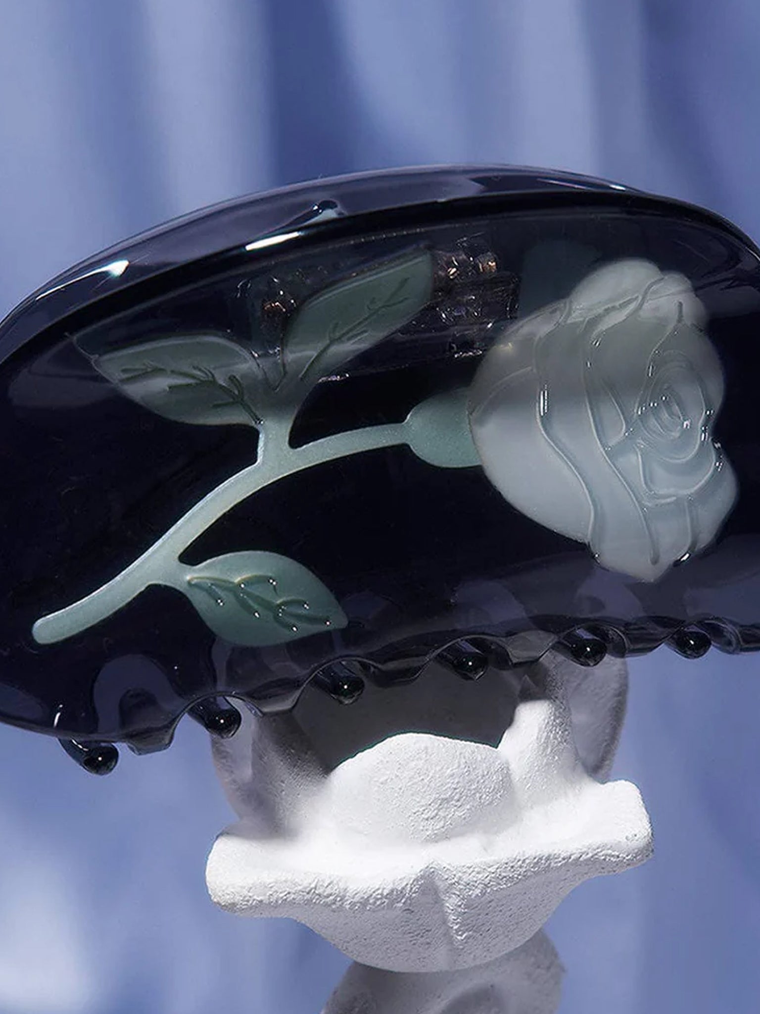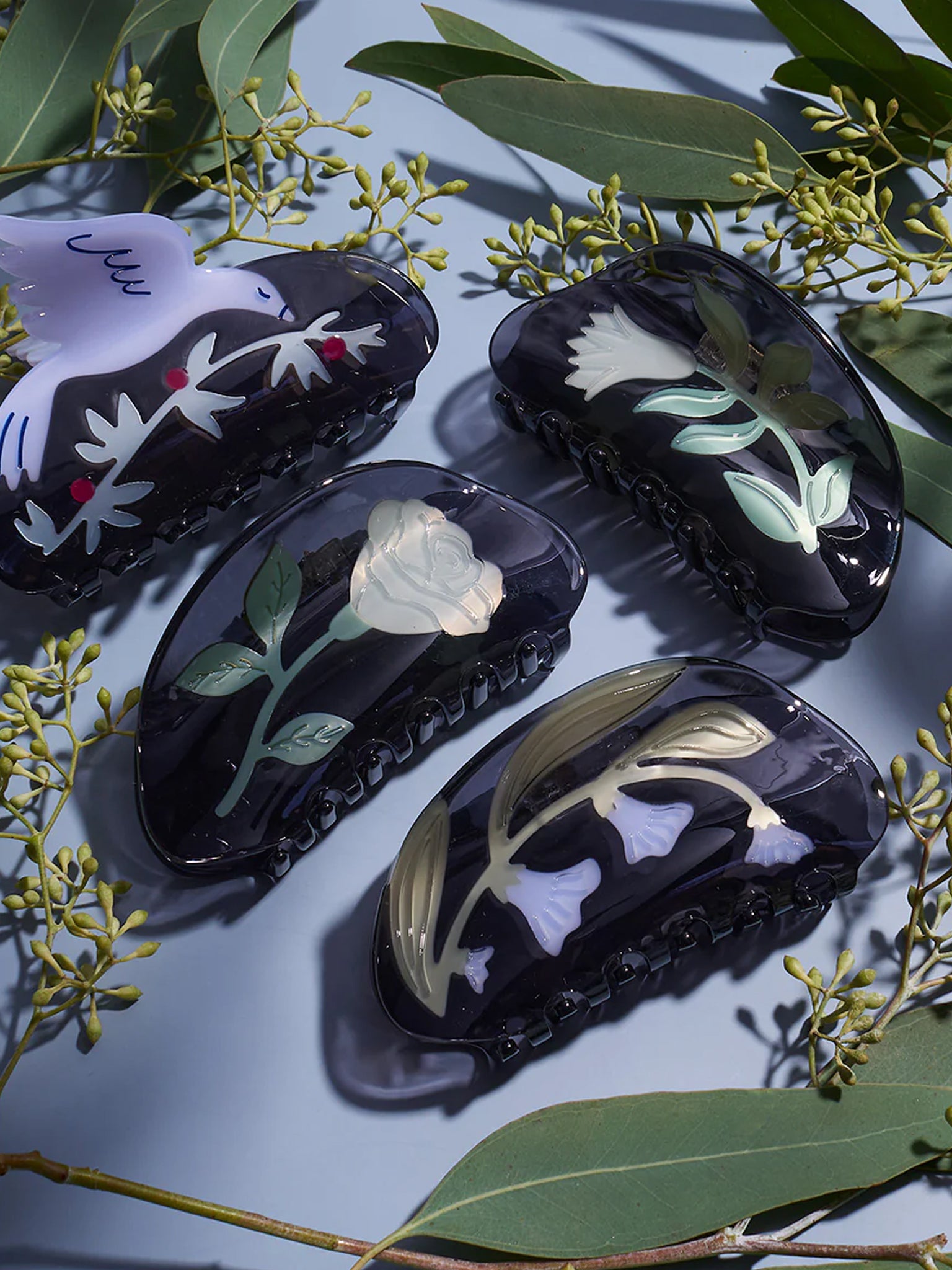 A single ghostly rose, engraved with intricate detail, gleams in the centre of this claw. Named for the Rosalia festival, a day of remembrance marked by adornment with rose garlands and flower crowns.