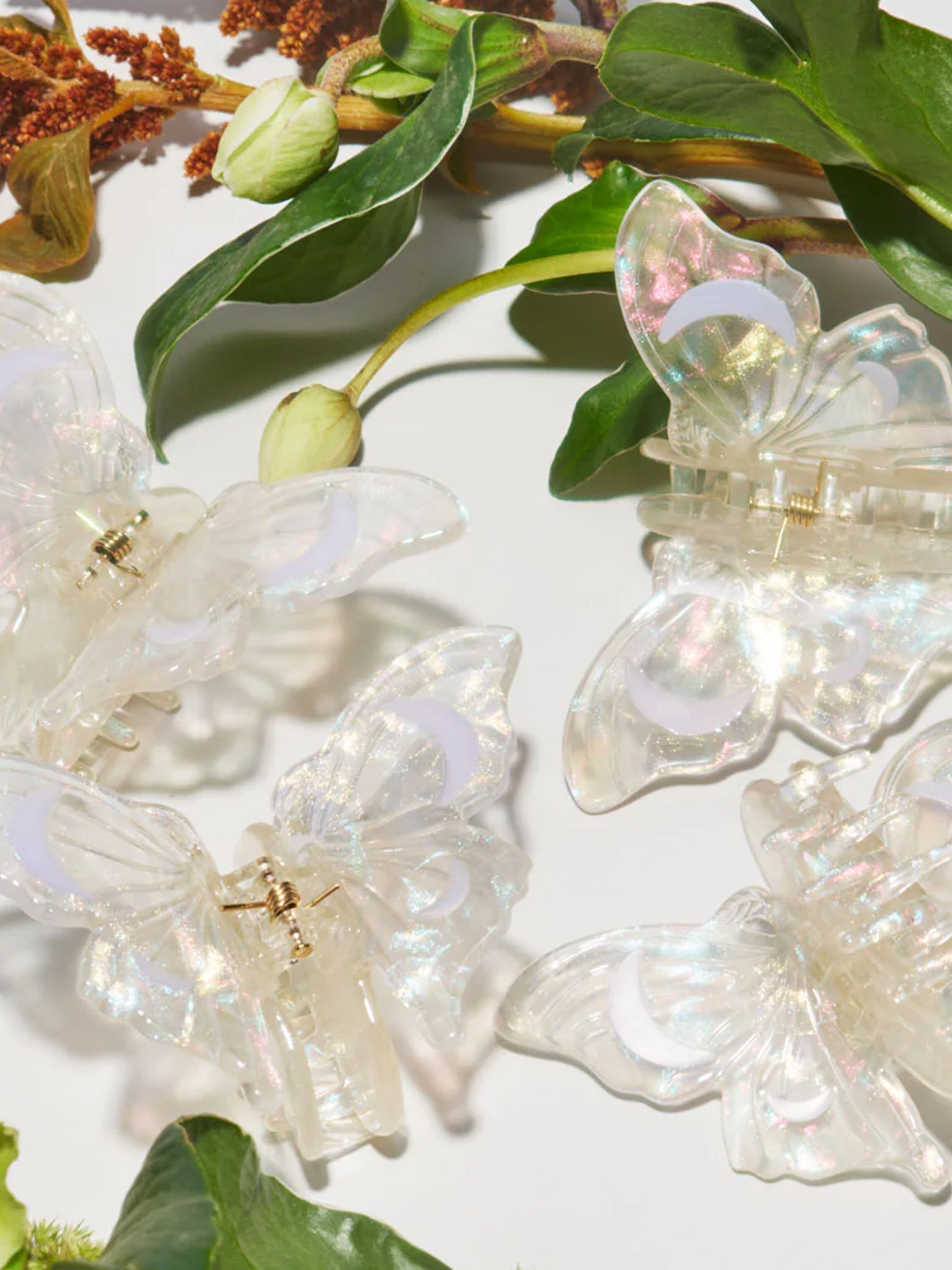 Designed to resemble the small iridescent White Satin Moth. This elegant crystal clear claw with inlay crescent moon designs is fit for a wood nymph.