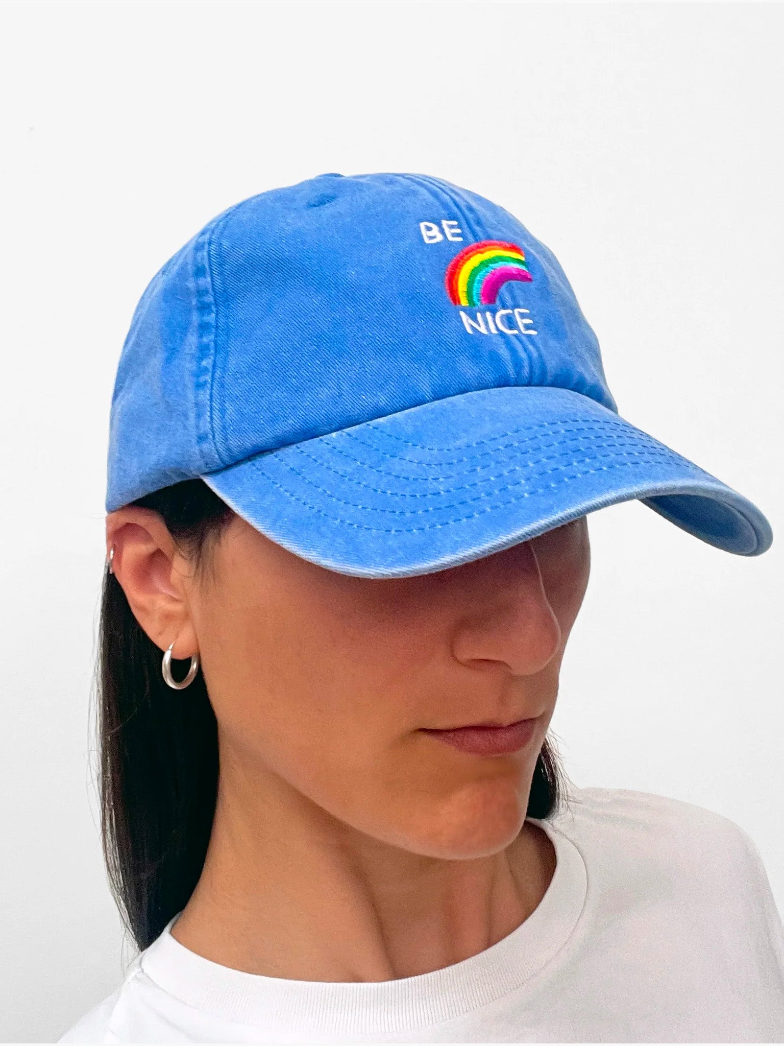 A vintage blue denim cap with Be Nice rainbow artwork embroidery. Adapted and designed from the iconic limited edition screenprint.