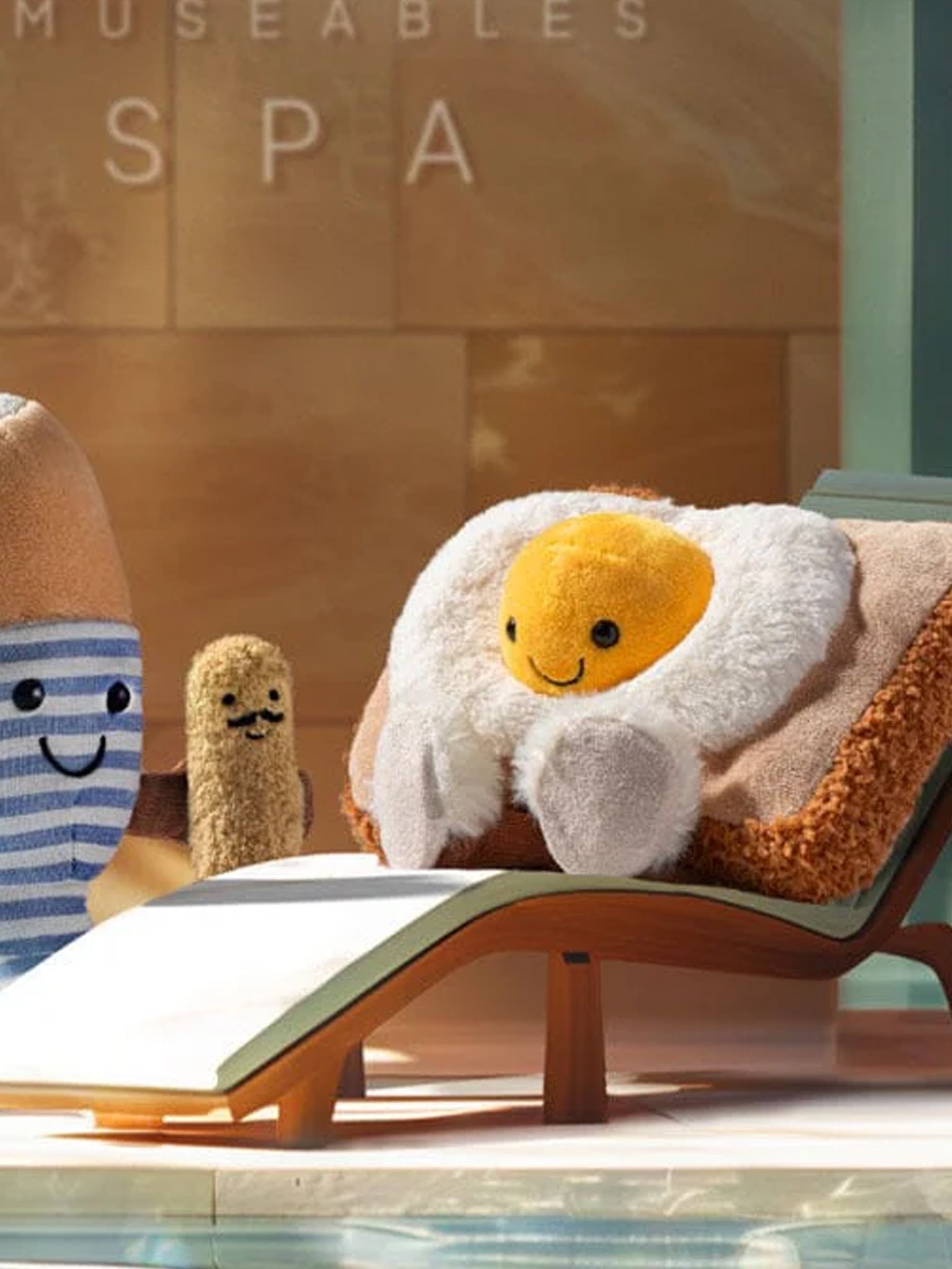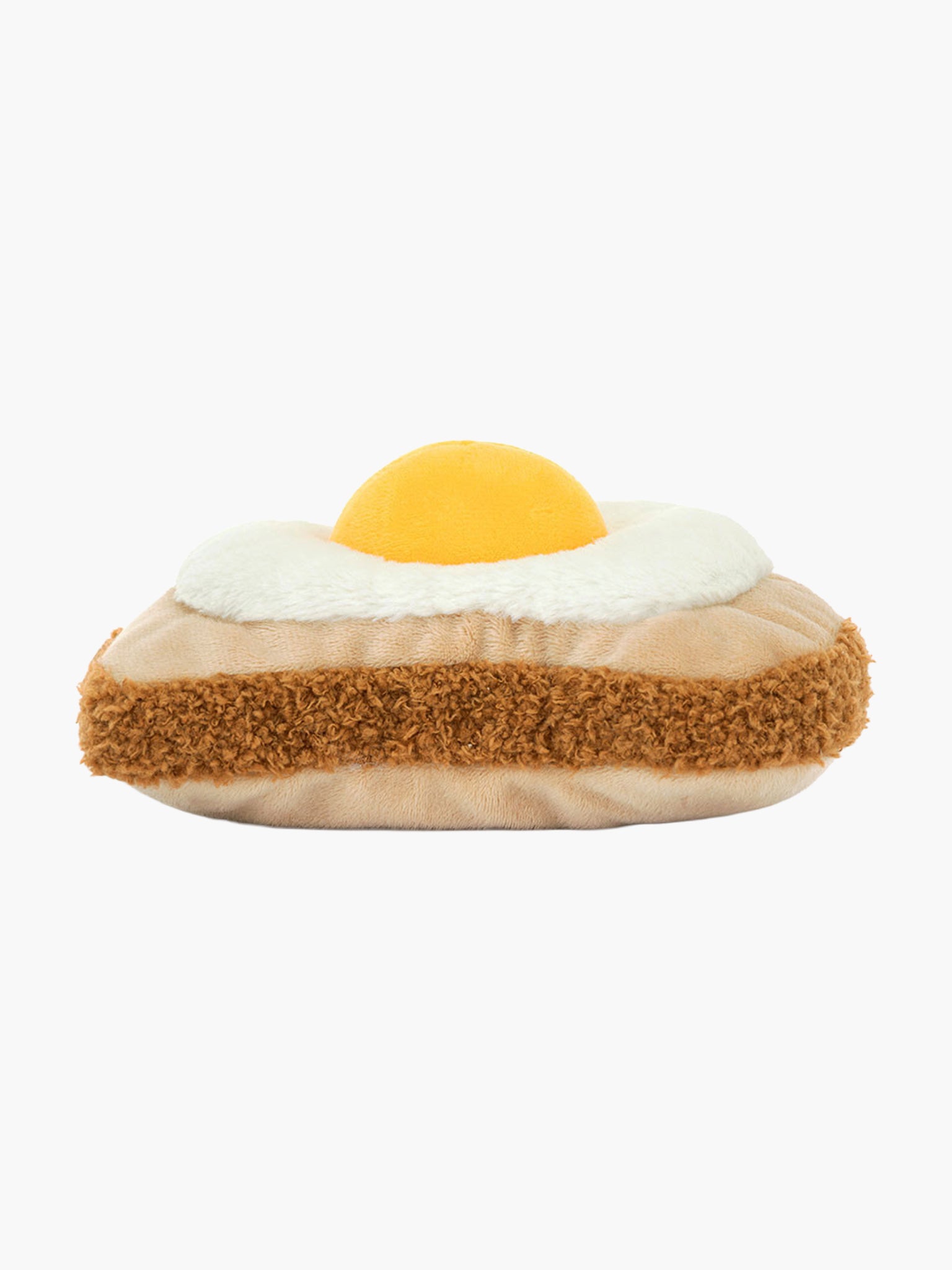 Amuseables Egglantine Egg on Toast is the breakfast of champion cuddlers. A fluffy egg fried sunny side up with bright, smiling yolk sits atop a perfectly toasted slice of bread with textured crust. With fine cord legs and white fluffy slippers, Egglantine starts every day right ? from self-care Sundays to meeting Mondays!