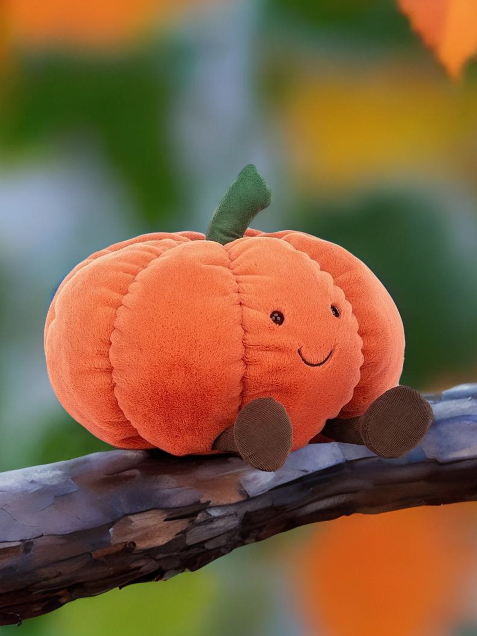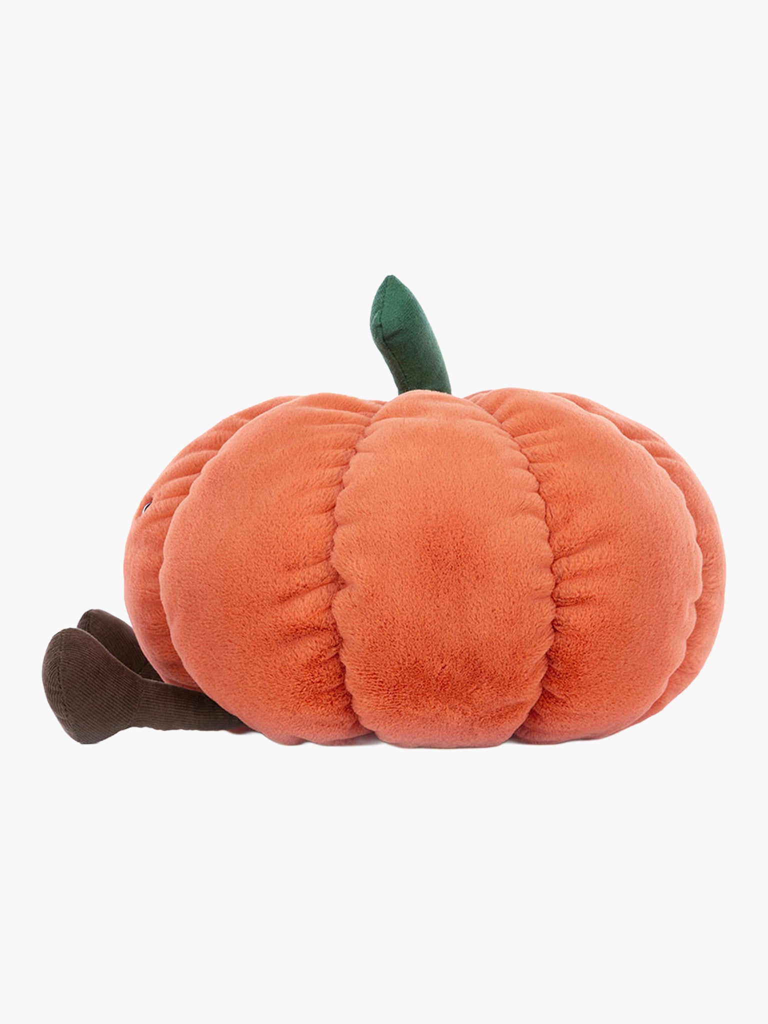 Amuseables Pumpkin is loveably plump with ruched stitch segments in terracotta orange. A vibrant veggie with brown cord boots and a jaunty green suedette stalk, this pumpkin rules the patch!