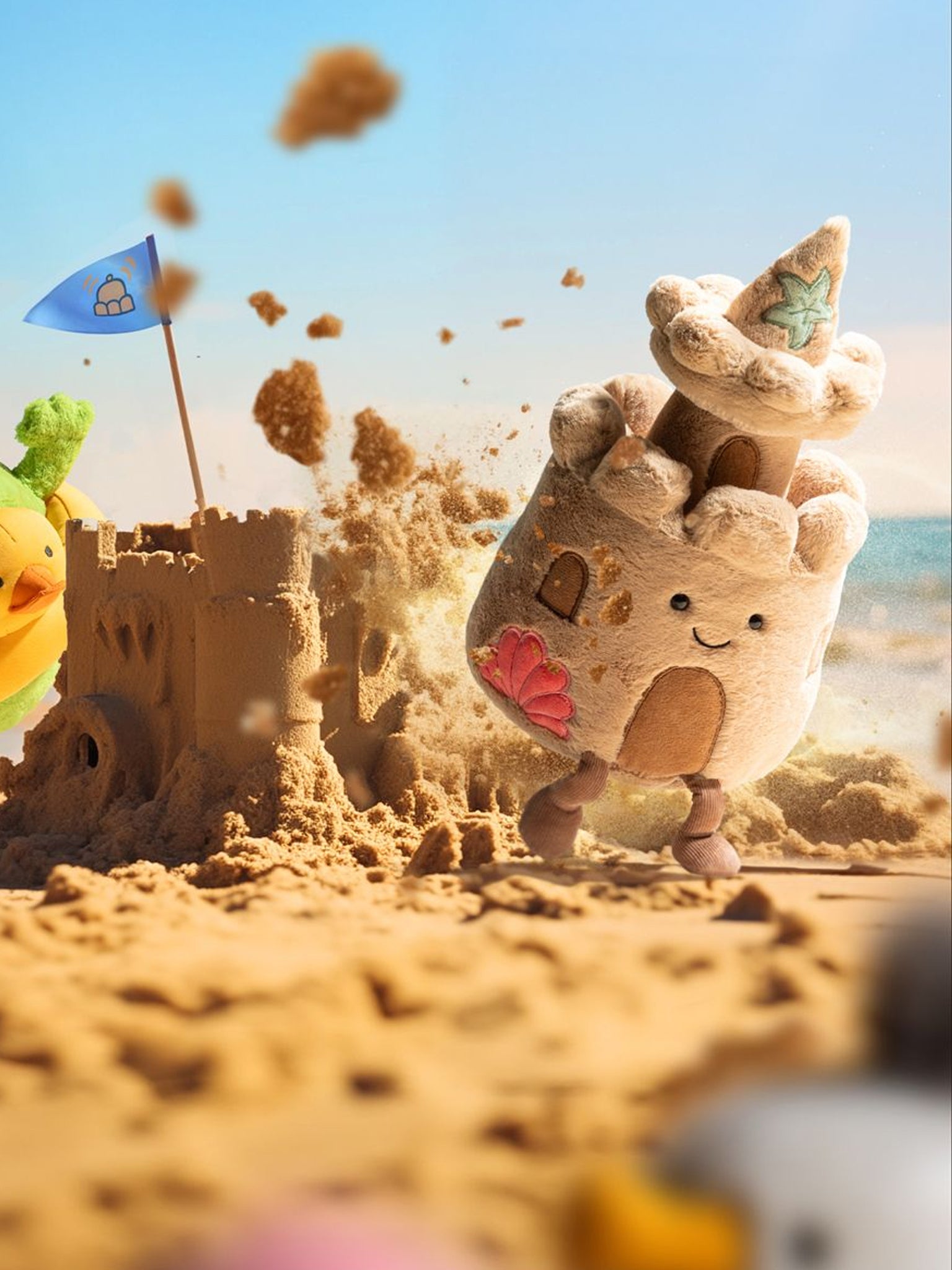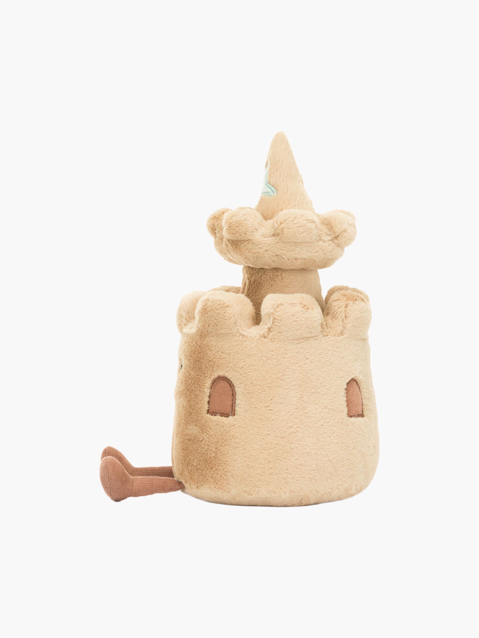 Amuseables Sandcastle is a beachy favourite! Sculpted from soft sandy fur, this smiling castle boasts textured windows and door, and a sandy tower. Decorated with mint and coral shells, this castle is fit for sandy royalty!