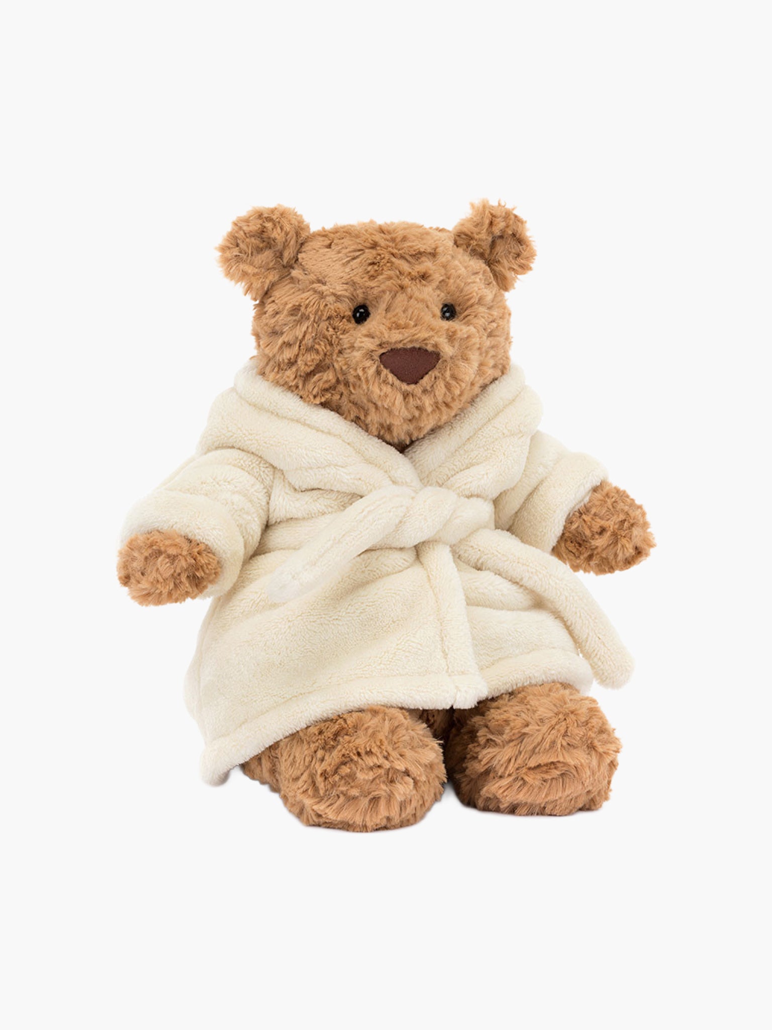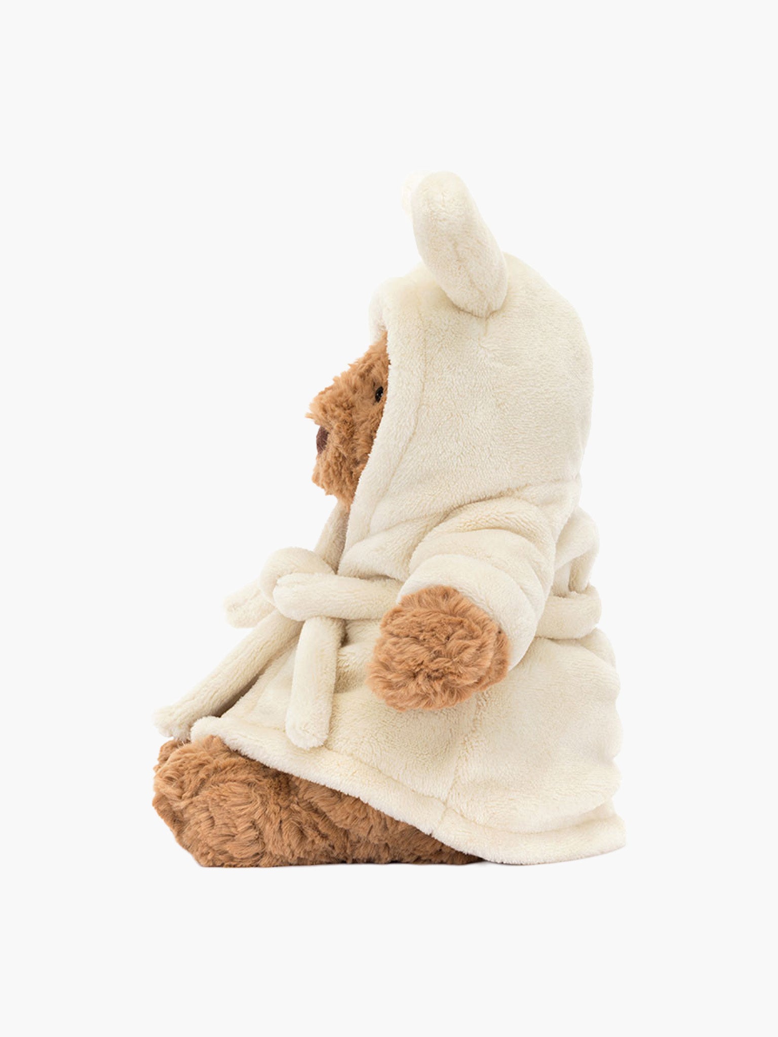 Bartholomew Bear is ready to relax! This soft textured fudge bear has put on his oatmeal towelling bathrobe with floppy bunny ears, ready to be pampered.
