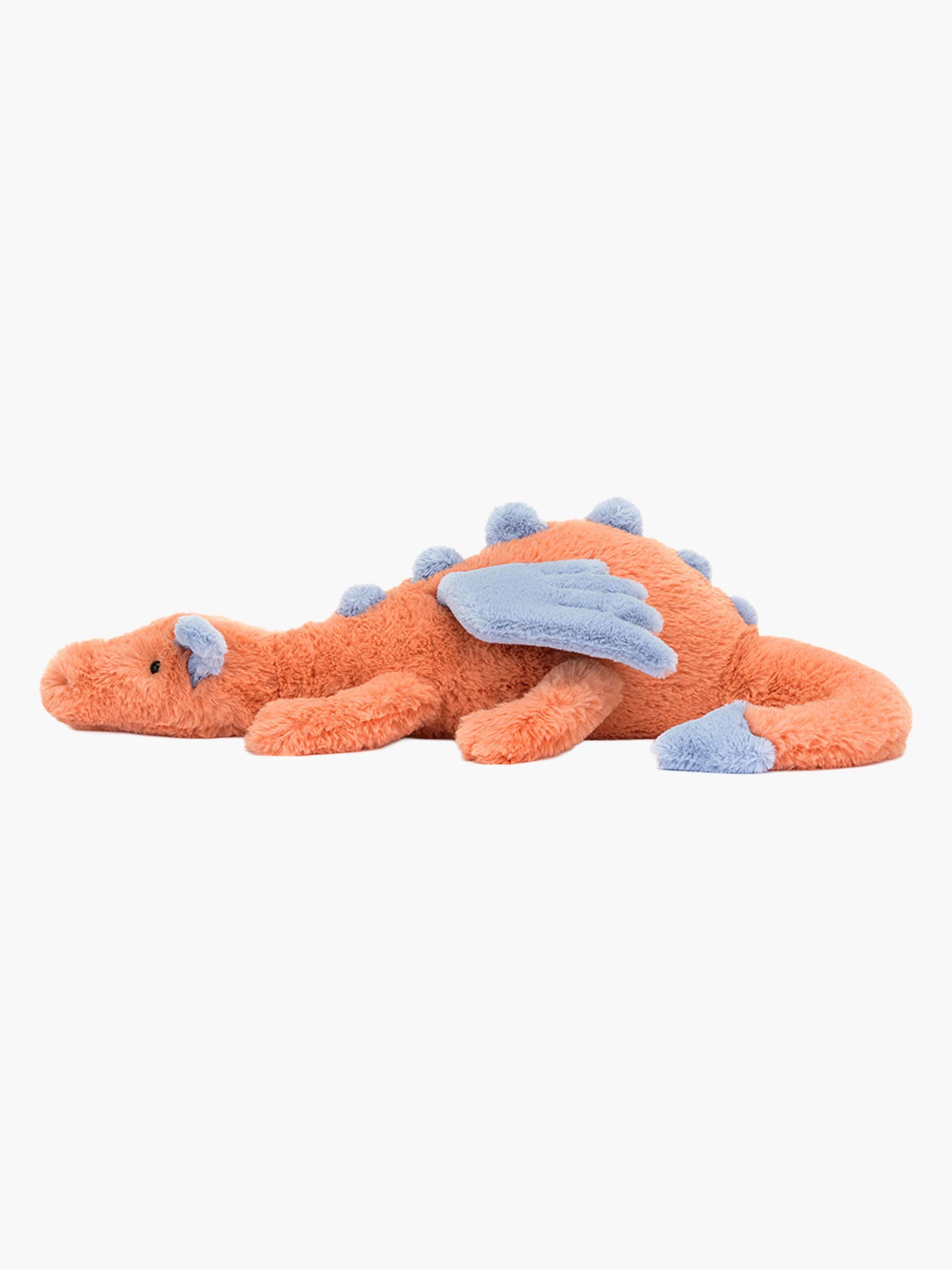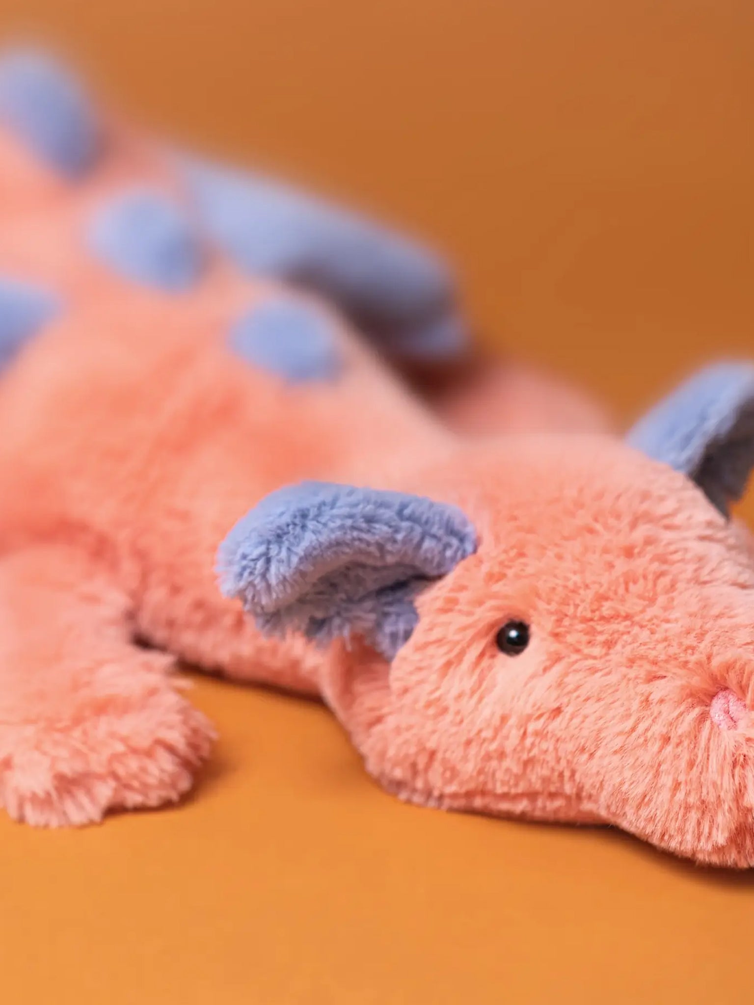 Persimmon Dragon is stretching out so we can admire that vibrant fur! This warm coral dragon is carefully detailed with delicate stitching all over. With indigo wings, ears, spines and tail dart, flopsy paws and a long, weighted tail, Persimmon brightens up any nursery.