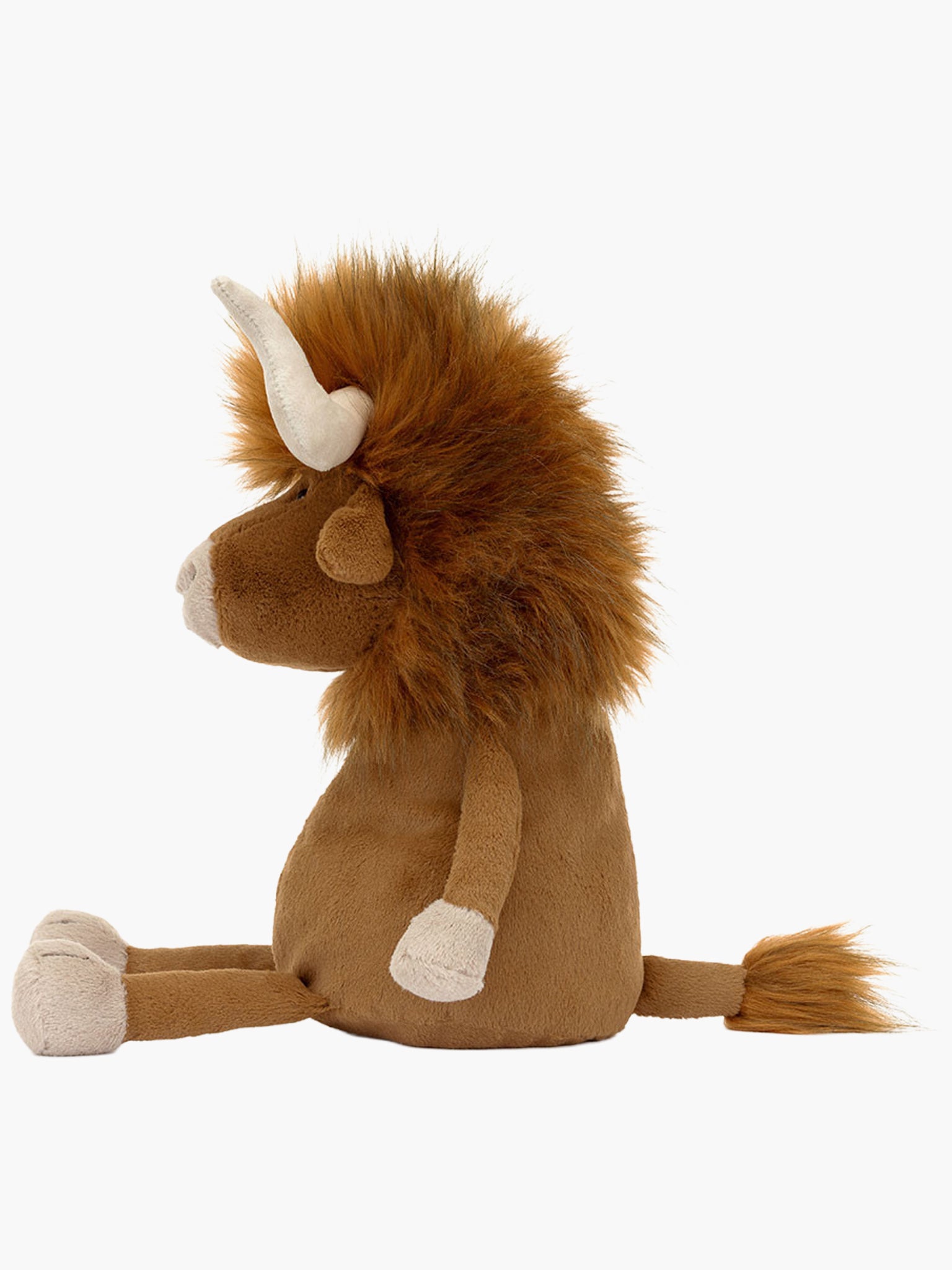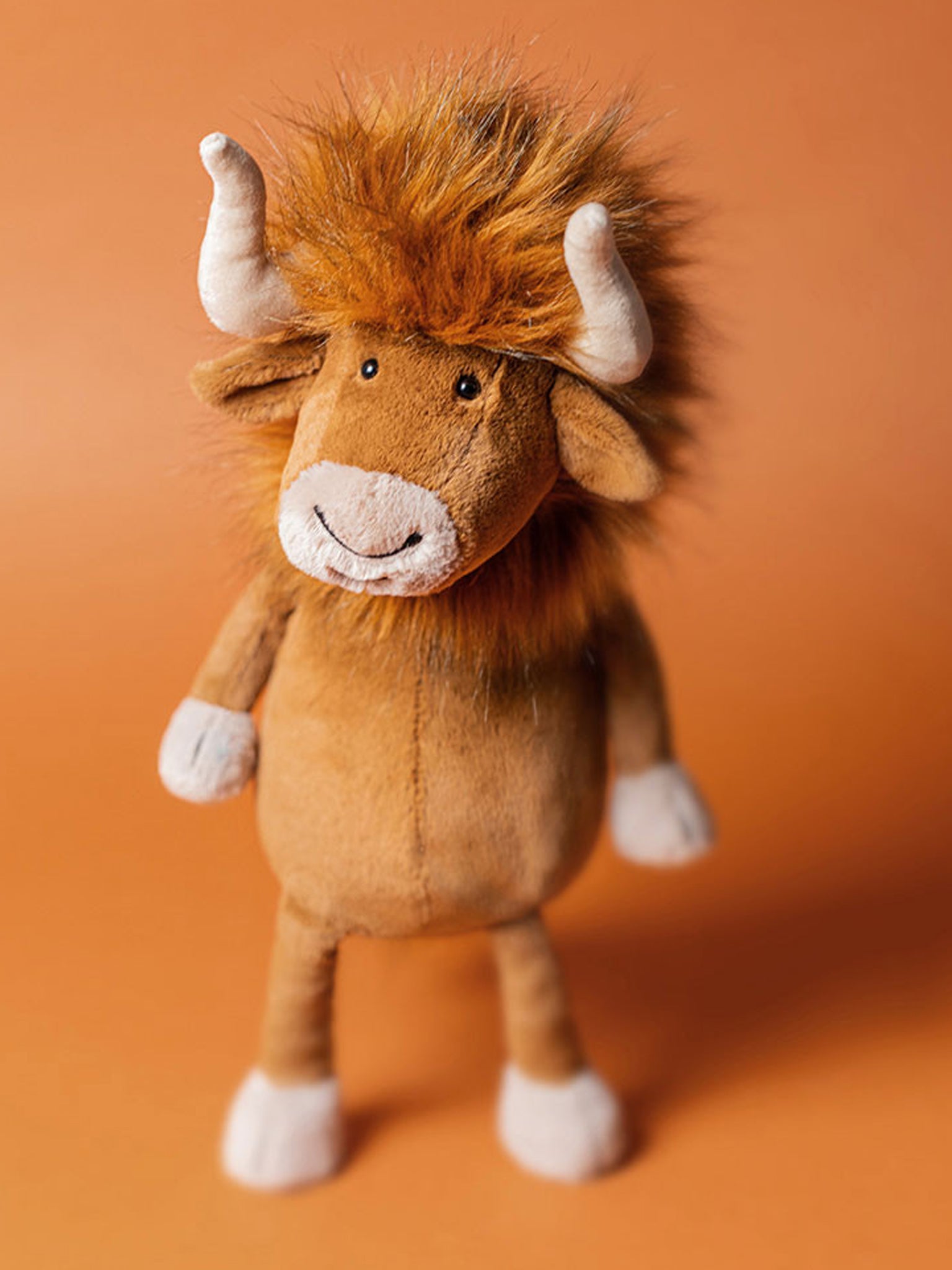Ramone Bull has a wild mane of silky fur in ginger and charcoal. This sturdy bull has beige suedette horns, a cinnamon tum and a tassel tail. Ramone's got a huge stitched nougat nose and matching cloven hooves.