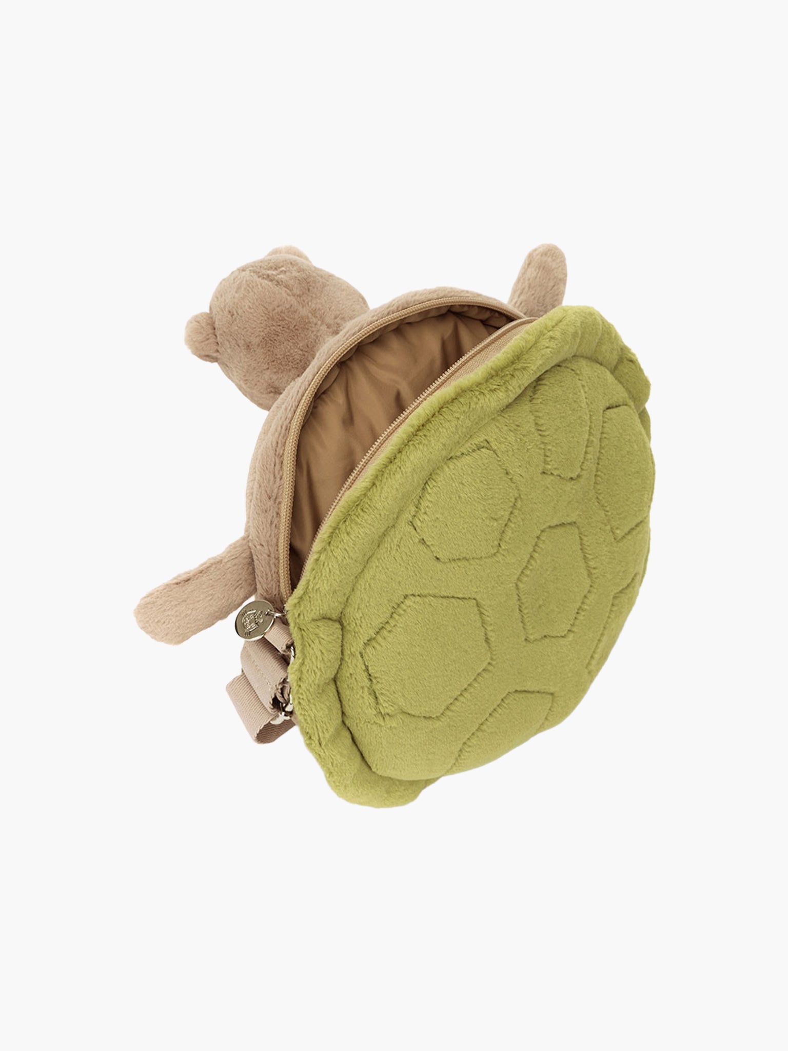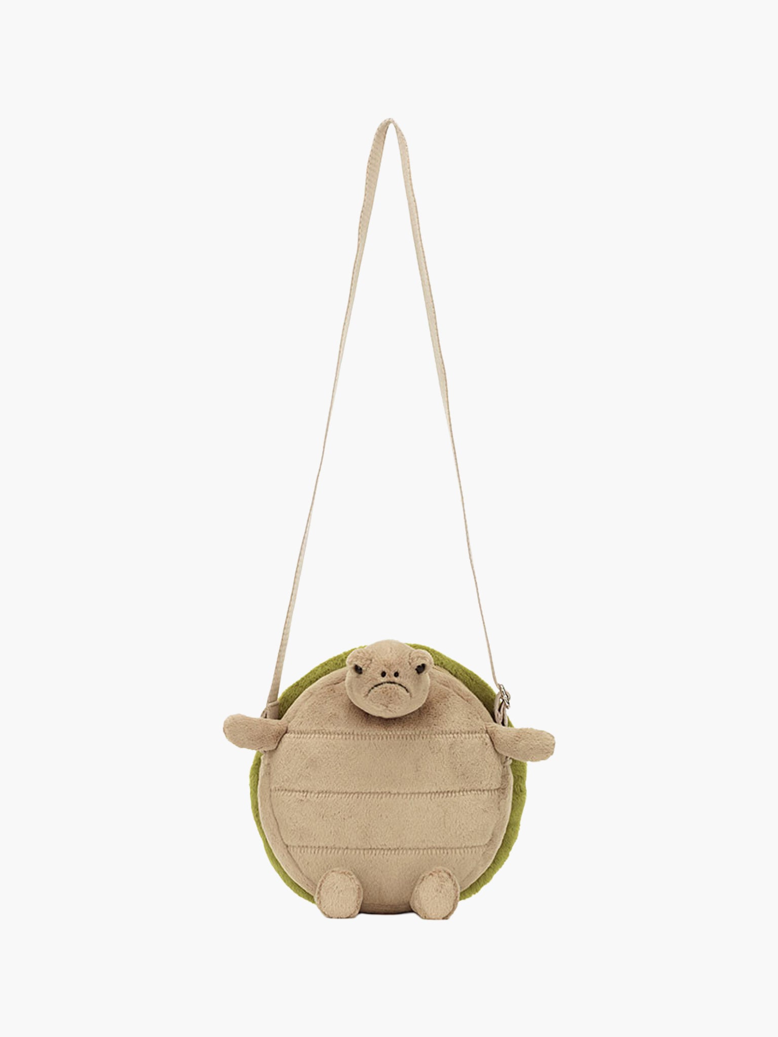The Timmy Turtle Bag is charmingly grumpy, with a textured beige tum and embroidered green shell. The strong webbed strap will keep Timmy safe riding on a shoulder. With a silver zipper, Jellycat tag and protective beige satin lining, this bag holds everything but grudges!