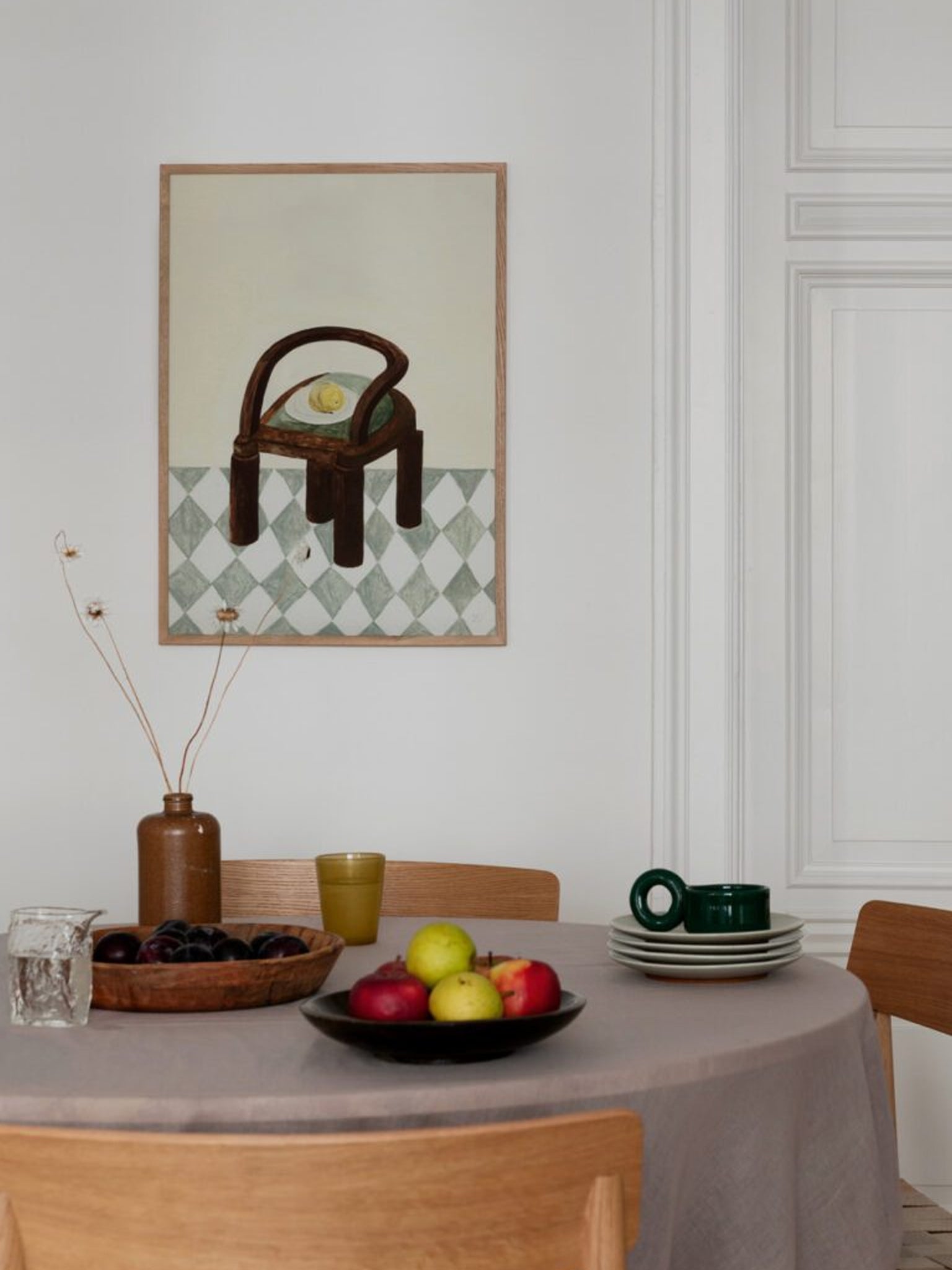 The creative process for Isabelle usually starts with an unfinished idea in mind that she nurtures by looking through inspiring photos, going for a walk in nature or looking through local thrift markets: “I give attention to the small things — details I see and try to project into my art.” Being outside and exploring is also how she narrows down the colour palette. “I’m in love with colours! And I am always on the hunt for new colour combinations. When I have chosen a palette that feels right for the painting I start sketching,” she says.