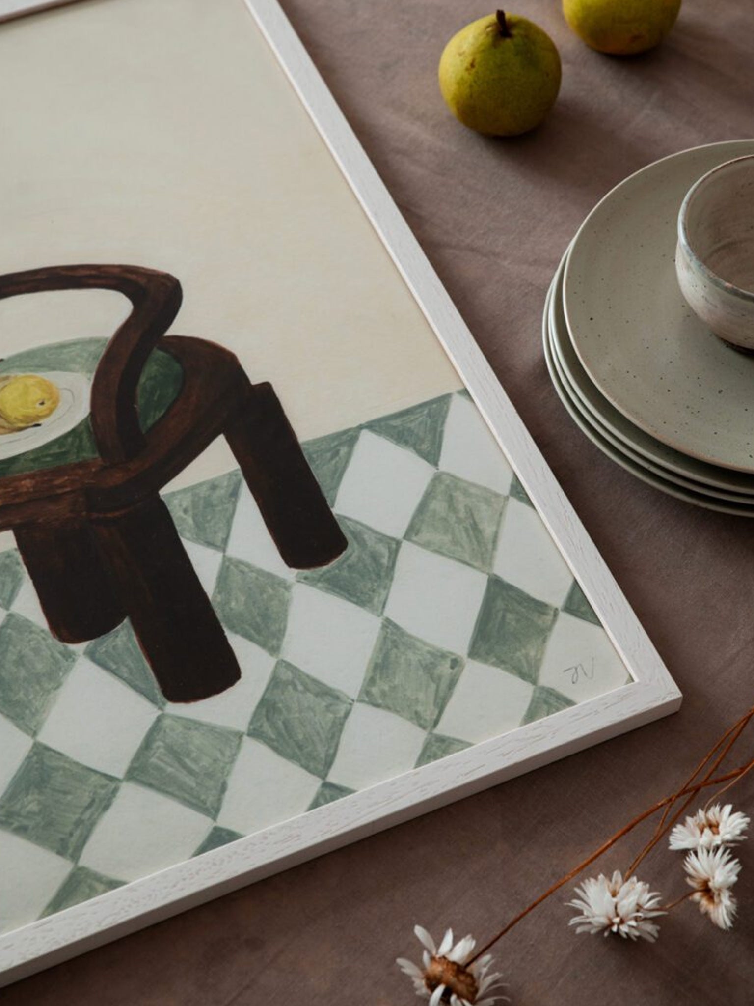 Drawing inspiration from the sunny side of everyday life, the Belgian-born artist Isabelle Vandeplassche combines colours in a way that creates an almost analogue atmosphere. Currently, Isabelle is situated in a small fisherman’s village in Portugal and the hues of the ocean, the quaint architecture and breezy greenery seep into her artworks, which she describes as playful yet calming.
