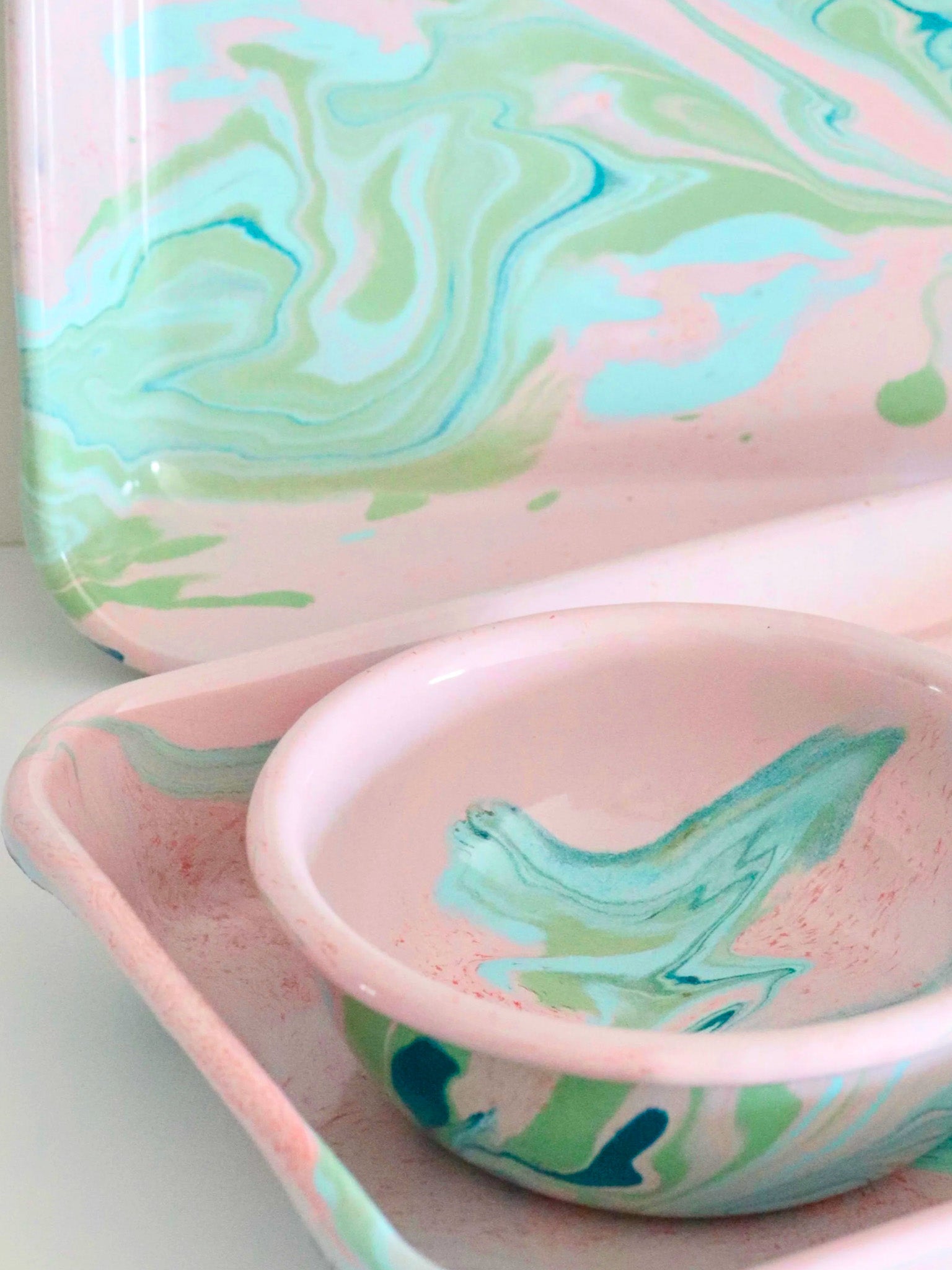 Bornn's products are made by fusing glass onto heavy-gauge steel. Every piece in their collections is handmade individually. The patterns may differ on each item showing the marks of its journey.