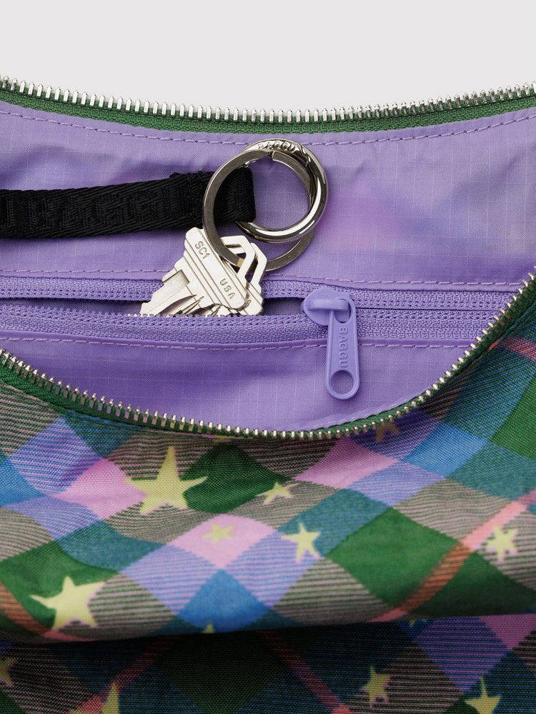 Medium Nylon Crescent Bag - Green Star Plaid
