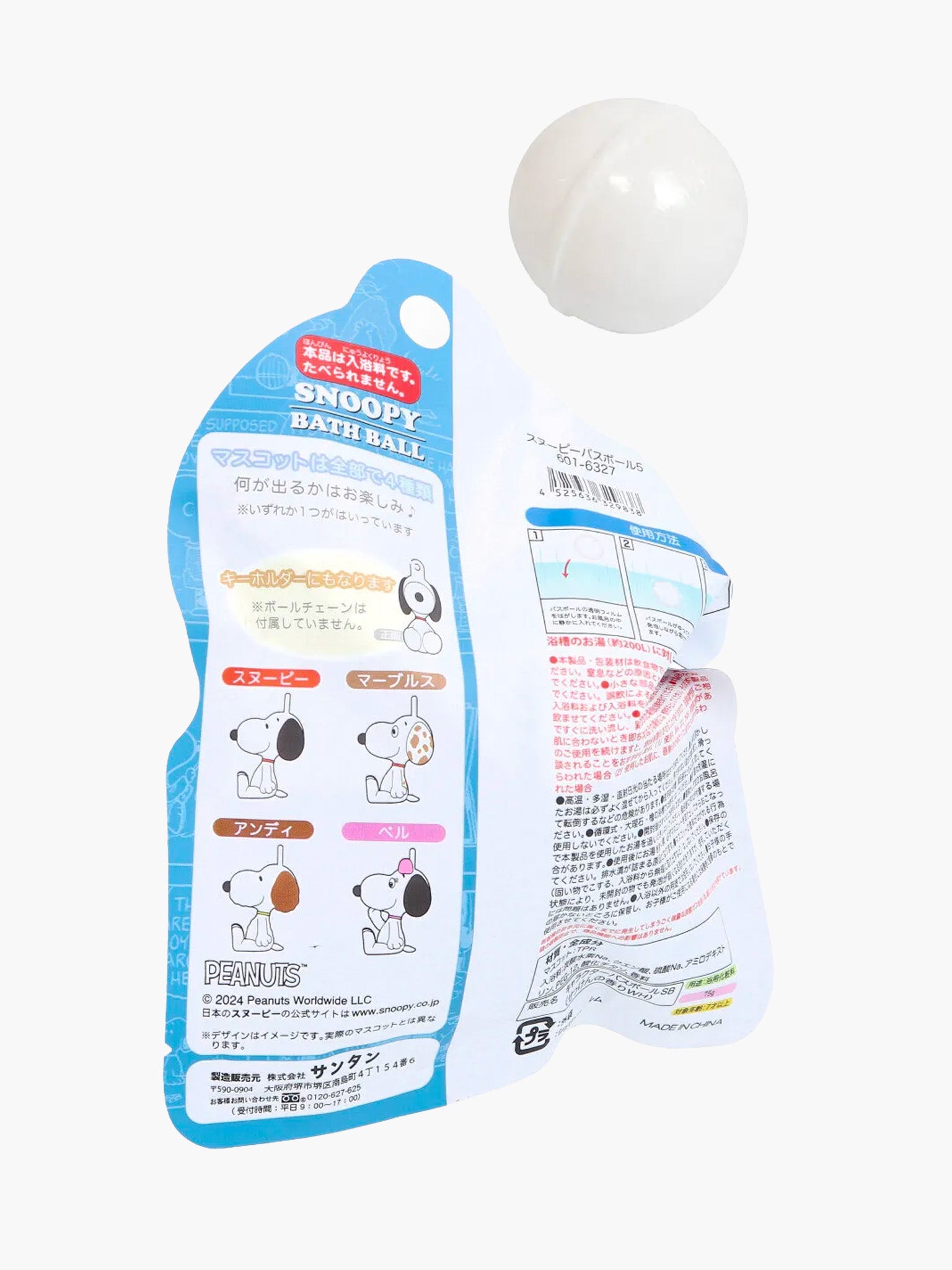 Inside the bath ball are Snoopy and other familiar PEANUTS character mascots such as Charlie Brown. The ball comes with a mascot of familiar PEANUTS characters including Snoopy and Charlie Brown. The ball can also be used as a keychain by attaching the ball chain. There are 4 kinds in total.