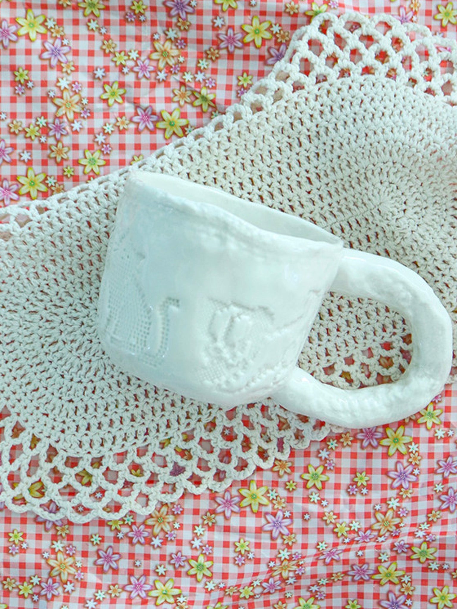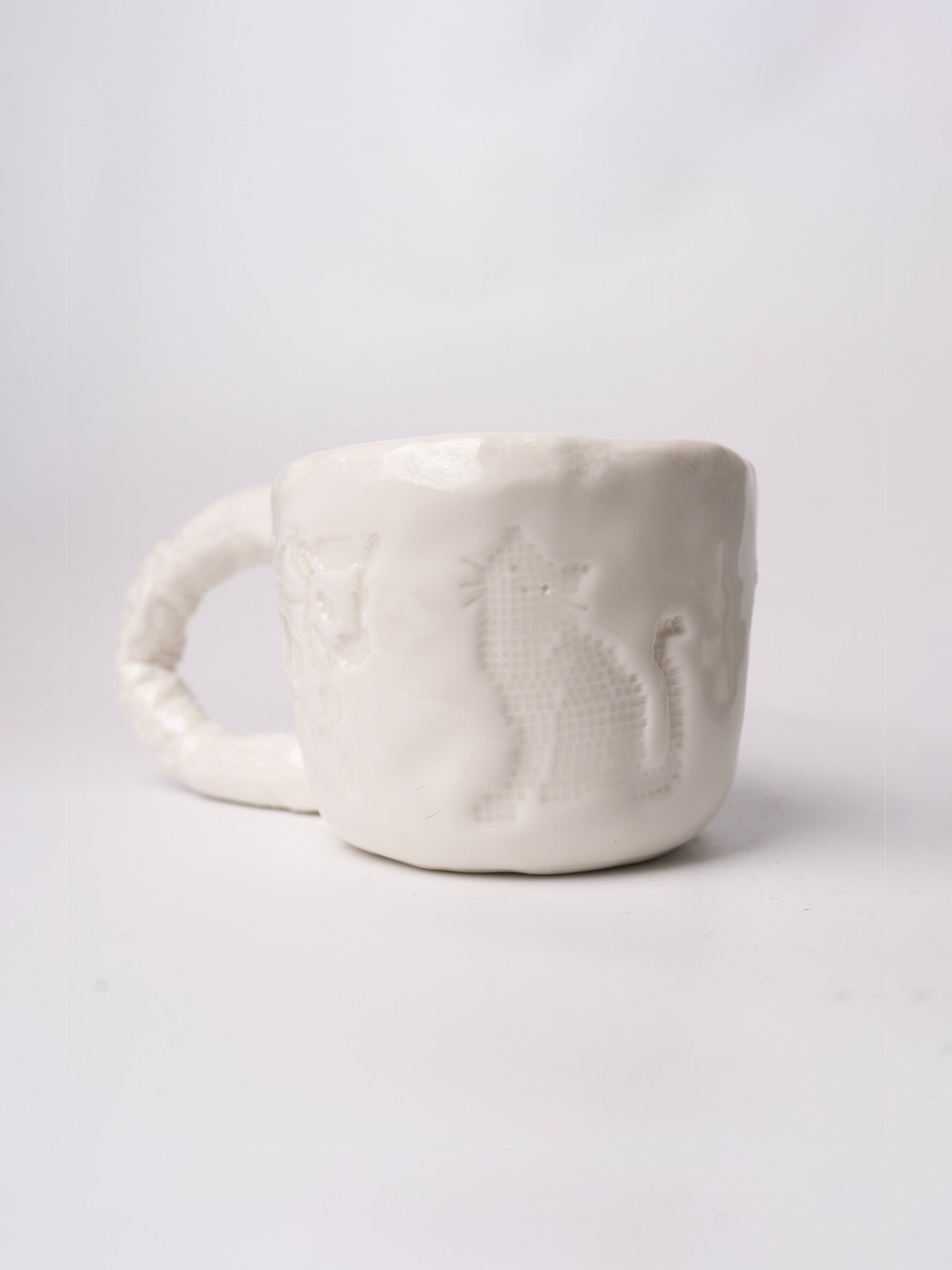 A generously sized mug printed with lace and cross-stitch motifs. It is surrounded by motifs of cats!