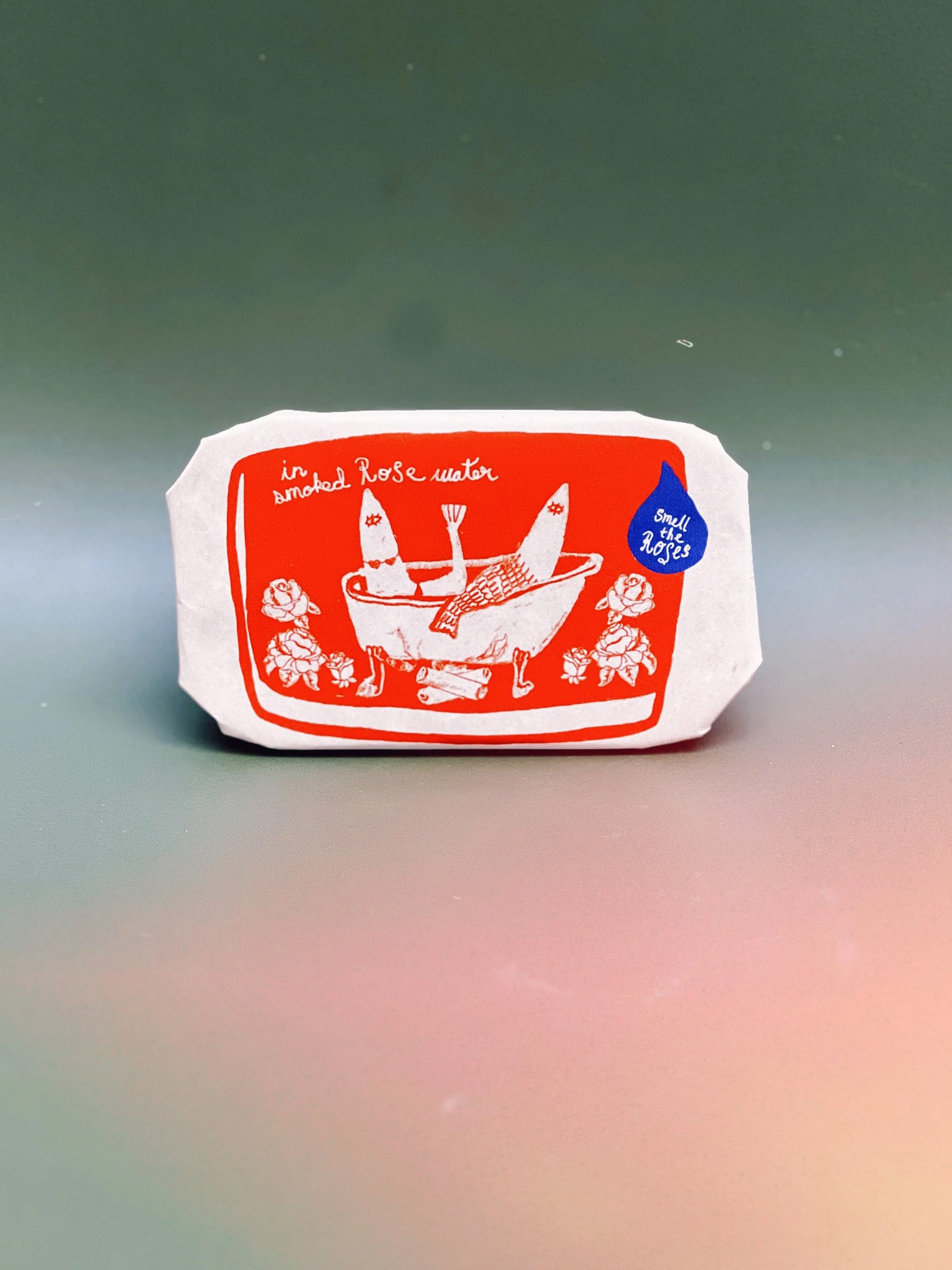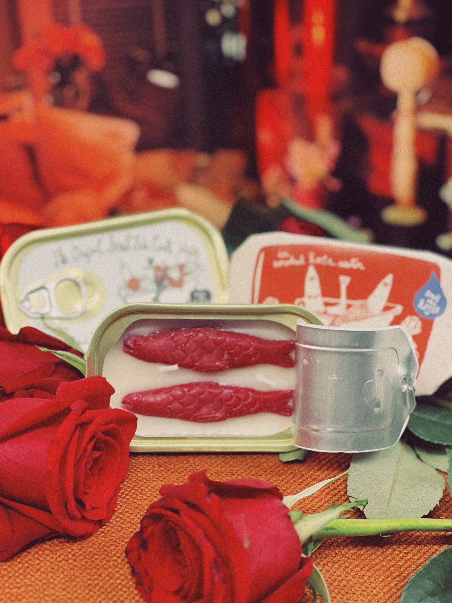 Experience the enchantment of Tinned Fish candles: hand-poured soy candles that mimic sardine cans. The magic begins as you peel back the tin lid, revealing a whimsical scene reminiscent of actual sardines in a tin. Dive into a sea of vibrant fish shapes elegantly suspended in olive oil-colored wax. As the gentle flame flickers, this delicate aroma combines the fresh fragrance of roses with the comforting scent of a campfire..
