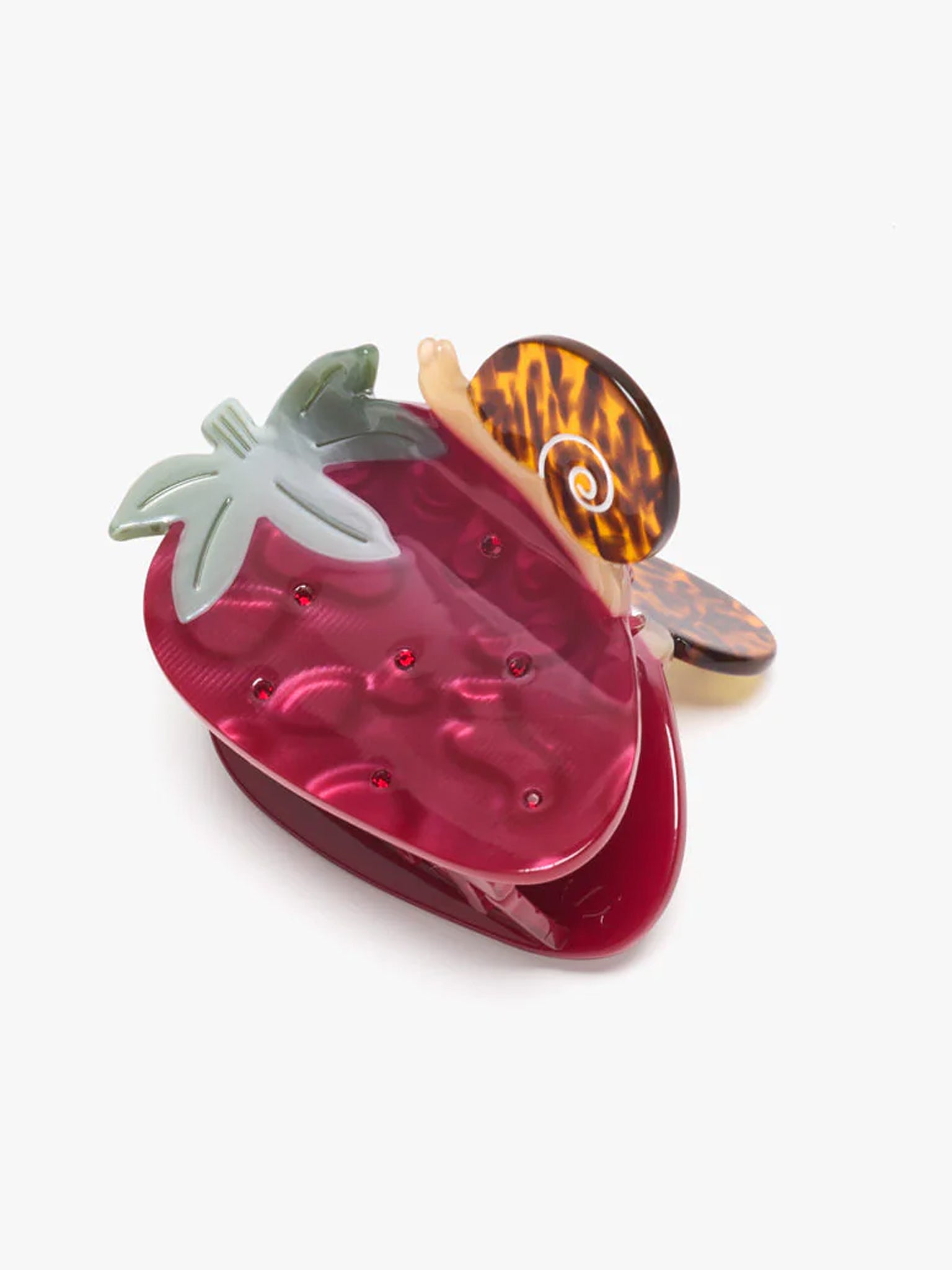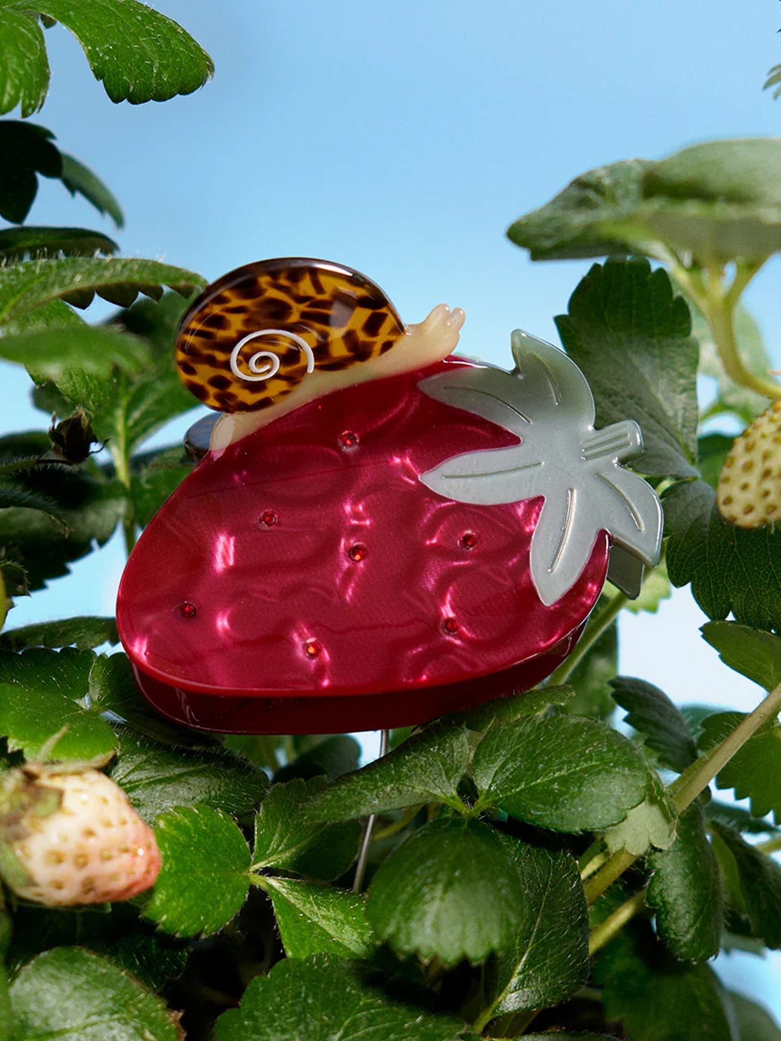 A sneaky snail mingles among freshly ripening strawberries. A claw dedicated to all gardeners guarding their harvest.