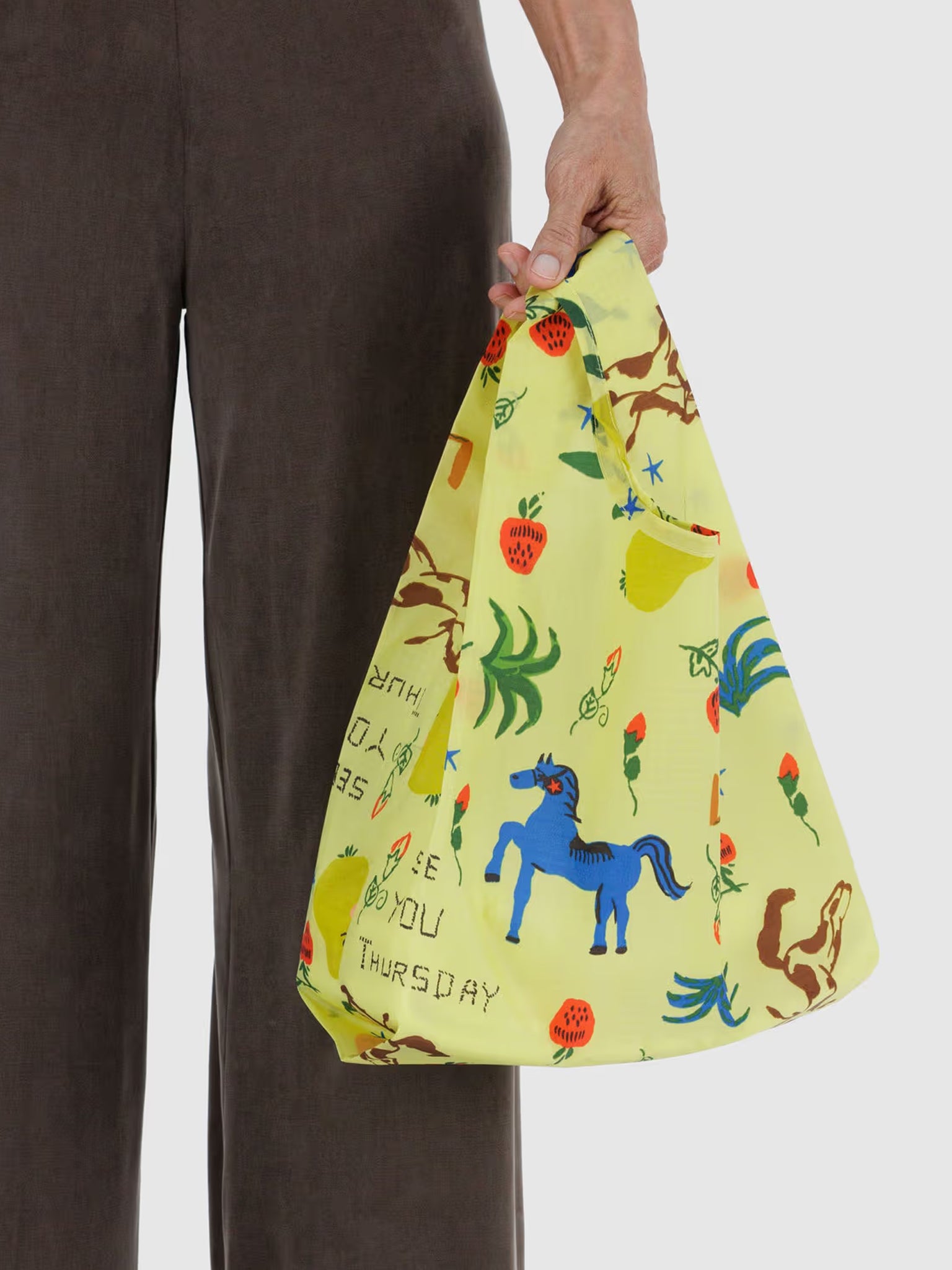 A smaller version of BAGGU's original reusable shopping bag. Perfect for your lunch, a six pack, extra shoes, or a trip to the corner store. This item has updated packaging with a new pouch loop!