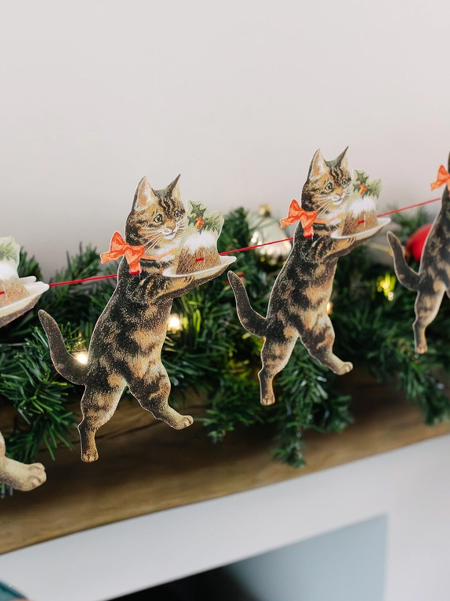A beautiful garland featuring ten repeated motifs of a tabby cat carrying a Christmas pudding wearing a red bow, a perfect addition to your decorations at Christmas.