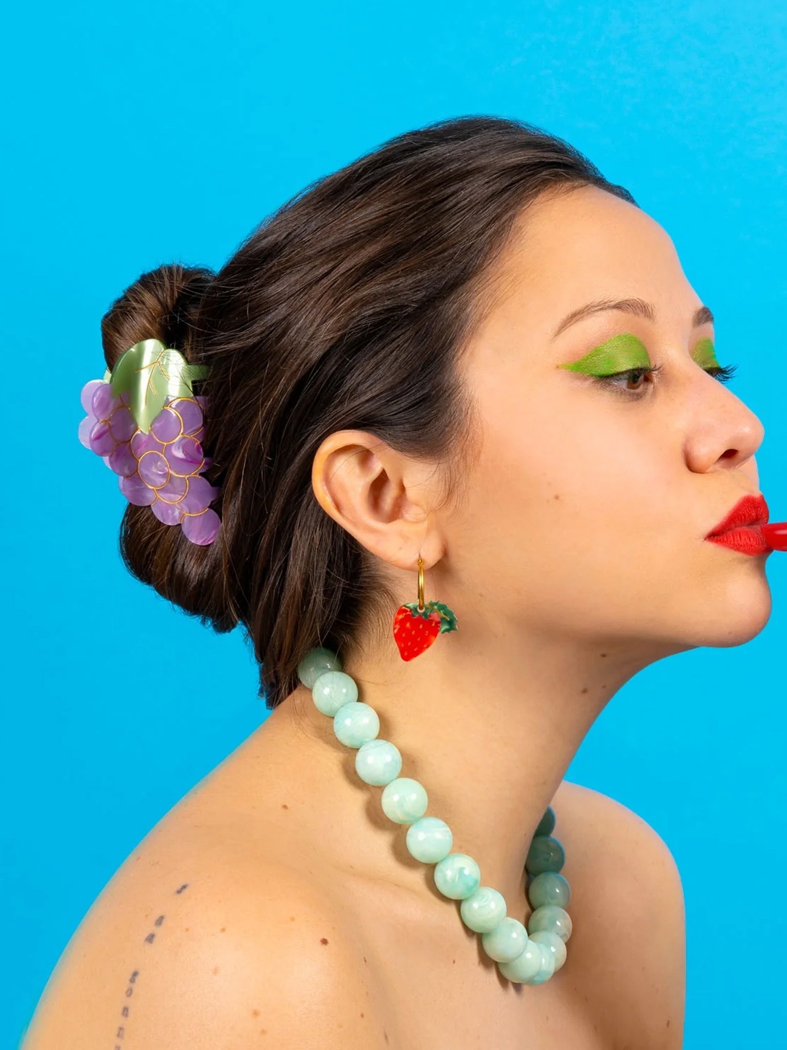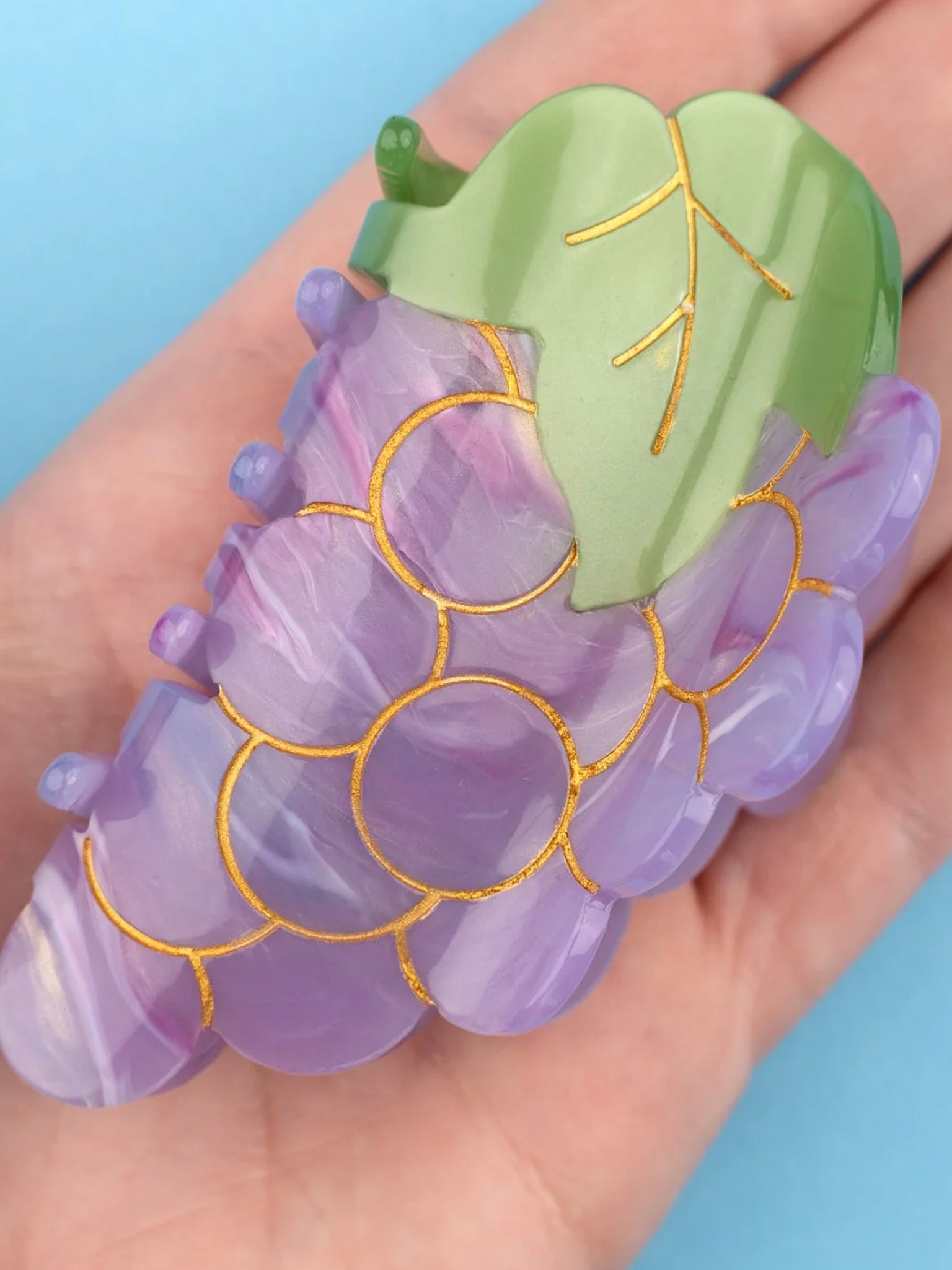 A beautiful hair claw shaped as a bunch of grapes, in iridescent lilac and green tones. We are in love with the romantic and vintage look of this fruity hair jewel, covered in details engraved with golden ink!